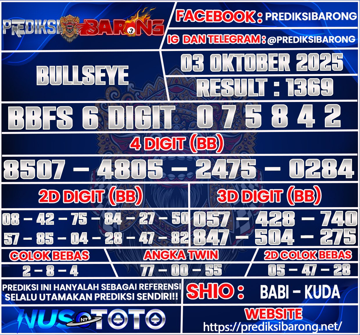 Selamat datang di Situs Prediksi Barong. Prediksi Barong merupakan situs prediksi angka togel yang berasal dari situs togel terpercaya dan teramanah yaitu NUSTOTO. Prediksi Barong sendiri sudah berdiri dari tahun 2019 hingga sekarang dan kualitasnya sudah di uji oleh para ahli paito dan pecinta togel resmi. Hari ini Prediksi Barong telah menyediakan Prediksi BULLSEYE Jumat 03 Oktober 2025 untuk anda semuanya.