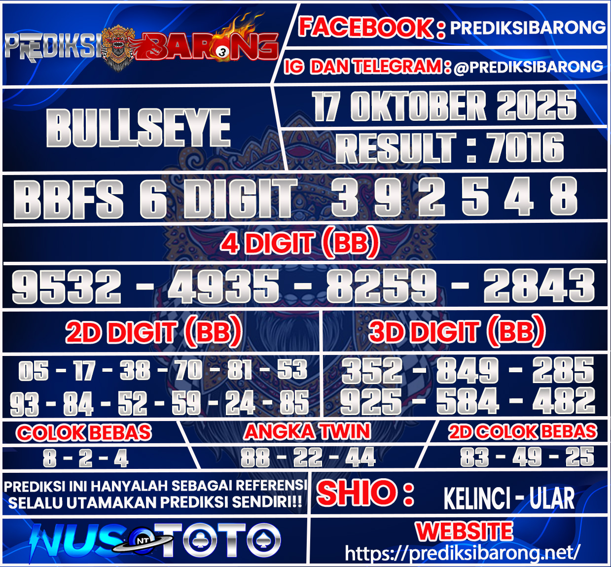 Prediksi Barong adalah layanan prediksi togel yang dirancang khusus untuk membantu para pemain togel dalam meraih keberuntungan. Pada edisi kali ini, kami menyajikan prediksi togel untuk pasar BULLSEYE pada Hari Kamis 16 Oktober 2025. Dengan analisis mendalam dan metode yang telah teruji, kami berusaha memberikan angka-angka yang memiliki potensi tinggi untuk keluar. Prediksi ini tidak hanya berdasarkan keberuntungan semata, tetapi juga menggunakan data statistik dan pola permainan sebelumnya yang dapat memberikan wawasan lebih bagi para pemain.