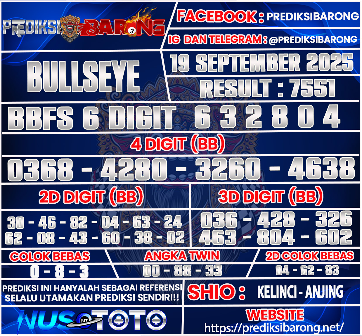 Selamat datang di Situs Prediksi Barong. Prediksi Barong merupakan situs prediksi angka togel yang berasal dari situs togel terpercaya dan teramanah yaitu NUSTOTO. Prediksi Barong sendiri sudah berdiri dari tahun 2019 hingga sekarang dan kualitasnya sudah di uji oleh para ahli paito dan pecinta togel resmi. Hari ini Prediksi Barong telah menyediakan Prediksi BULLSEYE Jumat 19 September 2025 untuk anda semuanya.