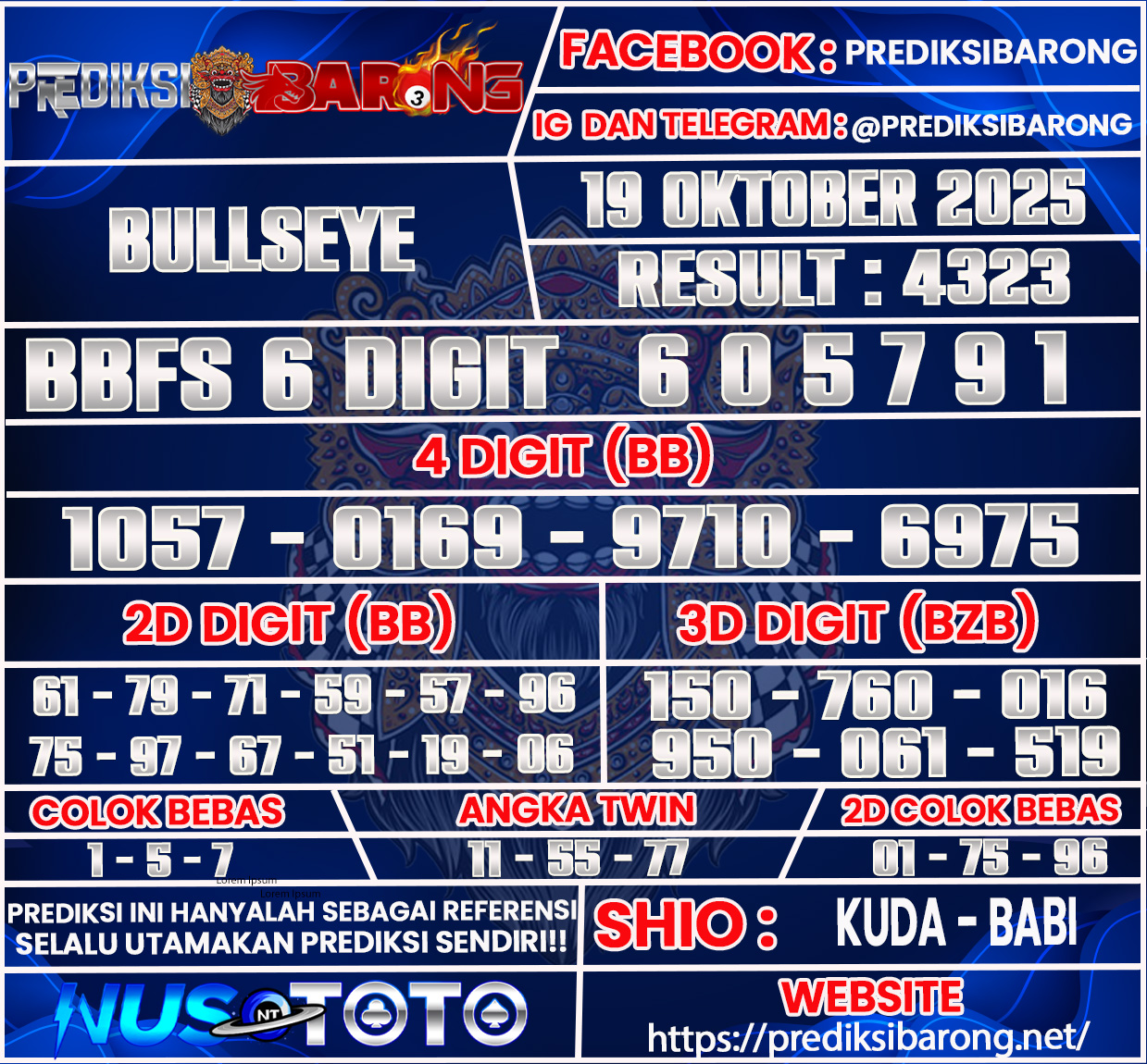 Selamat datang di Situs Prediksi Barong. Prediksi Barong merupakan situs prediksi angka togel yang berasal dari situs togel terpercaya dan teramanah yaitu NUSTOTO. Prediksi Barong sendiri sudah berdiri dari tahun 2019 hingga sekarang dan kualitasnya sudah di uji oleh para ahli paito dan pecinta togel resmi. Hari ini Prediksi Barong telah menyediakan Prediksi BULLSEYE Minggu 19 Oktober 2025 untuk anda semuanya.