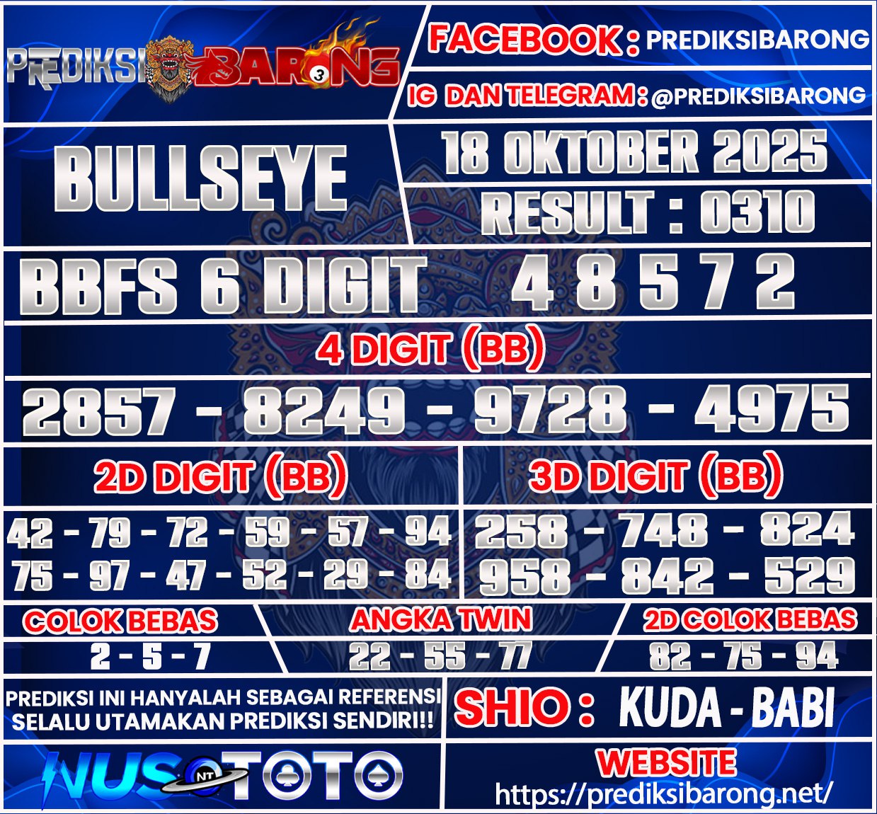 Oleh karena itu tanpa menunggu lama inilah Prediksi BULLSEYE Sabtu Tanggal 18 Oktober 2025 Dari Prediksi Barong :