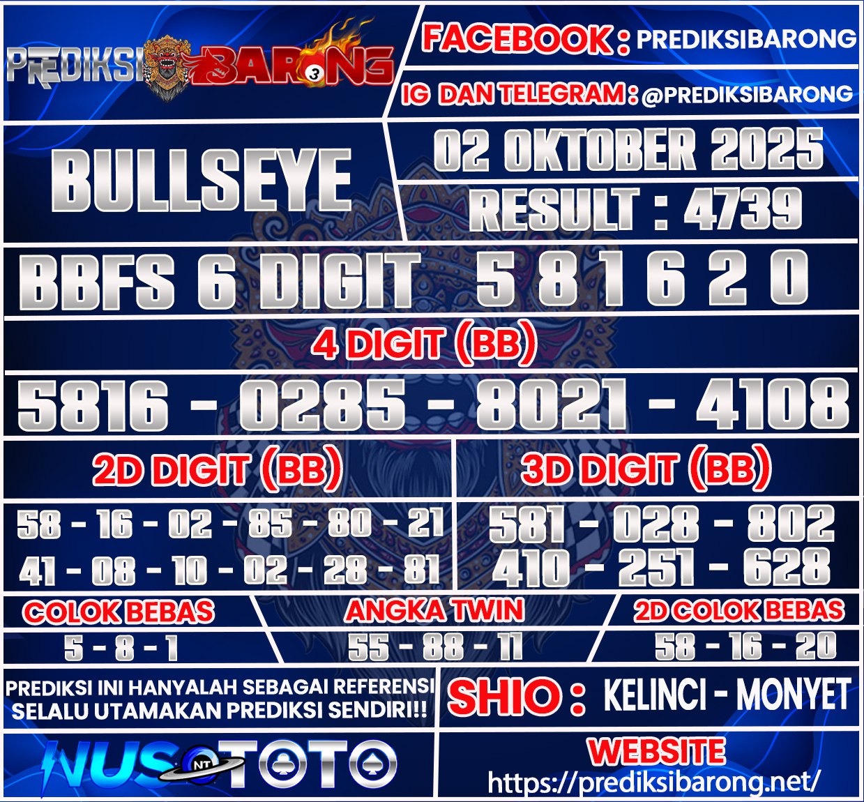 Selamat datang di Situs Prediksi Barong. Prediksi Barong merupakan situs prediksi angka togel yang berasal dari situs togel terpercaya dan teramanah yaitu NUSTOTO. Prediksi Barong sendiri sudah berdiri dari tahun 2019 hingga sekarang dan kualitasnya sudah di uji oleh para ahli paito dan pecinta togel resmi. Hari ini Prediksi Barong telah menyediakan Prediksi BULLSEYE Rabu 01 Oktober 2025 untuk anda semuanya.