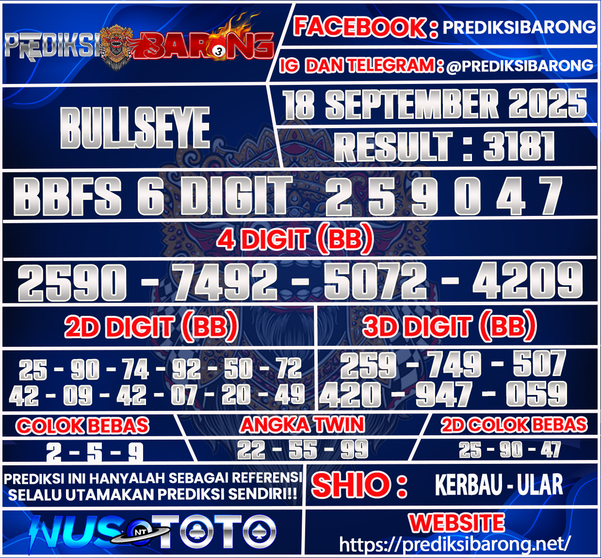 Selamat datang di Situs Prediksi Barong. Prediksi Barong merupakan situs prediksi angka togel yang berasal dari situs togel terpercaya dan teramanah yaitu NUSTOTO. Prediksi Barong sendiri sudah berdiri dari tahun 2018 hingga sekarang dan kualitasnya sudah di uji oleh para ahli paito dan pecinta togel resmi. Hari ini Prediksi Barong telah menyediakan Prediksi BULLSEYE Kamis 18  September 2025 untuk anda semuanya.