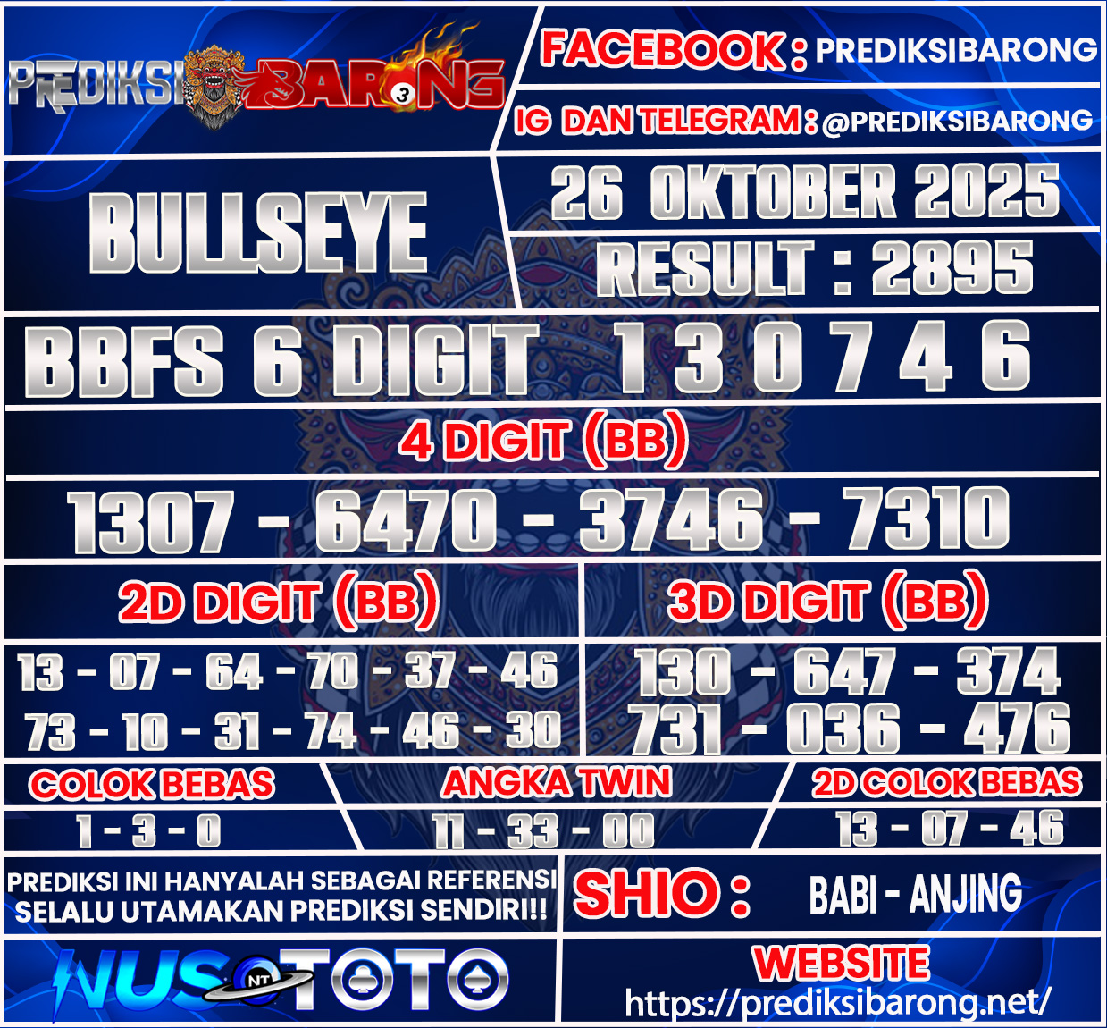 Selamat datang di Situs Prediksi Barong. Prediksi Barong merupakan situs prediksi angka togel yang berasal dari situs togel terpercaya dan teramanah yaitu NUSTOTO. Prediksi Barong sendiri sudah berdiri dari tahun 2019 hingga sekarang dan kualitasnya sudah di uji oleh para ahli paito dan pecinta togel resmi. Hari ini Prediksi Barong telah menyediakan Prediksi BULLSEYE Sabtu 25 Oktober 2025 untuk anda semuanya.