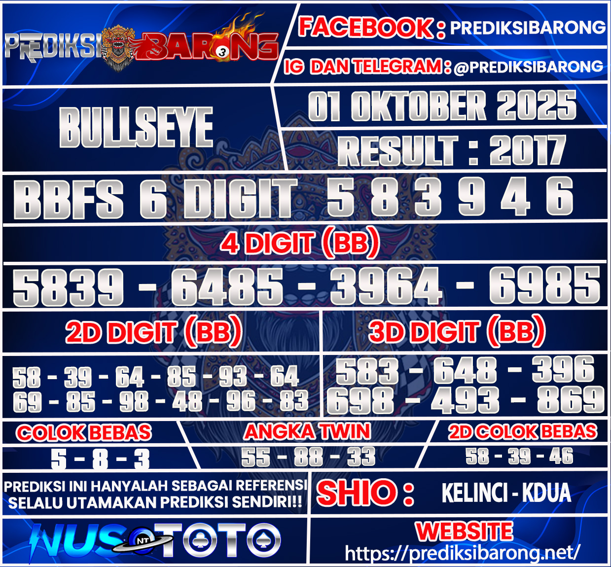 Selamat datang di Situs Prediksi Barong. Prediksi Barong merupakan situs prediksi angka togel yang berasal dari situs togel terpercaya dan teramanah yaitu NUSTOTO. Prediksi Barong sendiri sudah berdiri dari tahun 2019 hingga sekarang dan kualitasnya sudah di uji oleh para ahli paito dan pecinta togel resmi. Hari ini Prediksi Barong telah menyediakan Prediksi BULLSEYE Rabu 01 Oktober 2025 untuk anda semuanya.