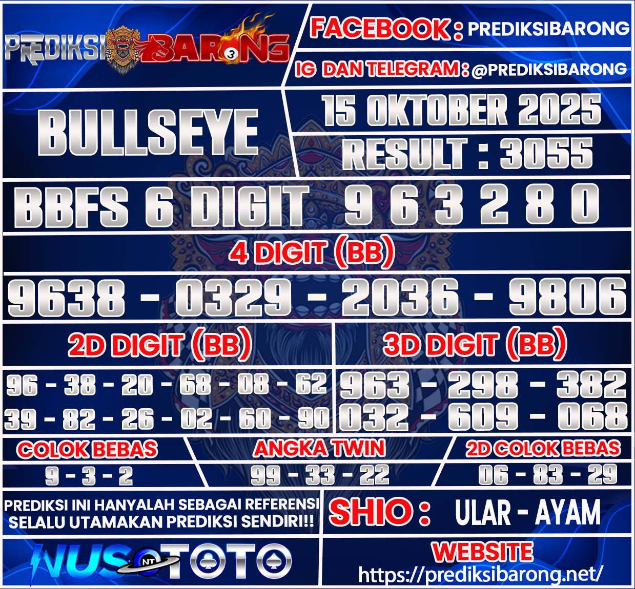 Prediksi Barong adalah layanan prediksi togel yang dirancang khusus untuk membantu para pemain togel dalam meraih keberuntungan. Pada edisi kali ini, kami menyajikan prediksi togel untuk pasar BULLSEYE pada Hari Rabu 15 Oktober 2025. Dengan analisis mendalam dan metode yang telah teruji, kami berusaha memberikan angka-angka yang memiliki potensi tinggi untuk keluar. Prediksi ini tidak hanya berdasarkan keberuntungan semata, tetapi juga menggunakan data statistik dan pola permainan sebelumnya yang dapat memberikan wawasan lebih bagi para pemain.
