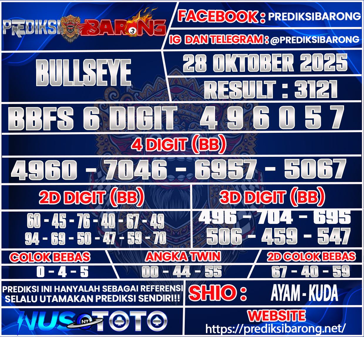 Selamat datang di Situs Prediksi Barong. Prediksi Barong merupakan situs prediksi angka togel yang berasal dari situs togel terpercaya dan teramanah yaitu NUSTOTO. Prediksi Barong sendiri sudah berdiri dari tahun 2019 hingga sekarang dan kualitasnya sudah di uji oleh para ahli paito dan pecinta togel resmi. Hari ini Prediksi Barong telah menyediakan Prediksi BULLSEYE Sabtu 25 Oktober 2025 untuk anda semuanya.