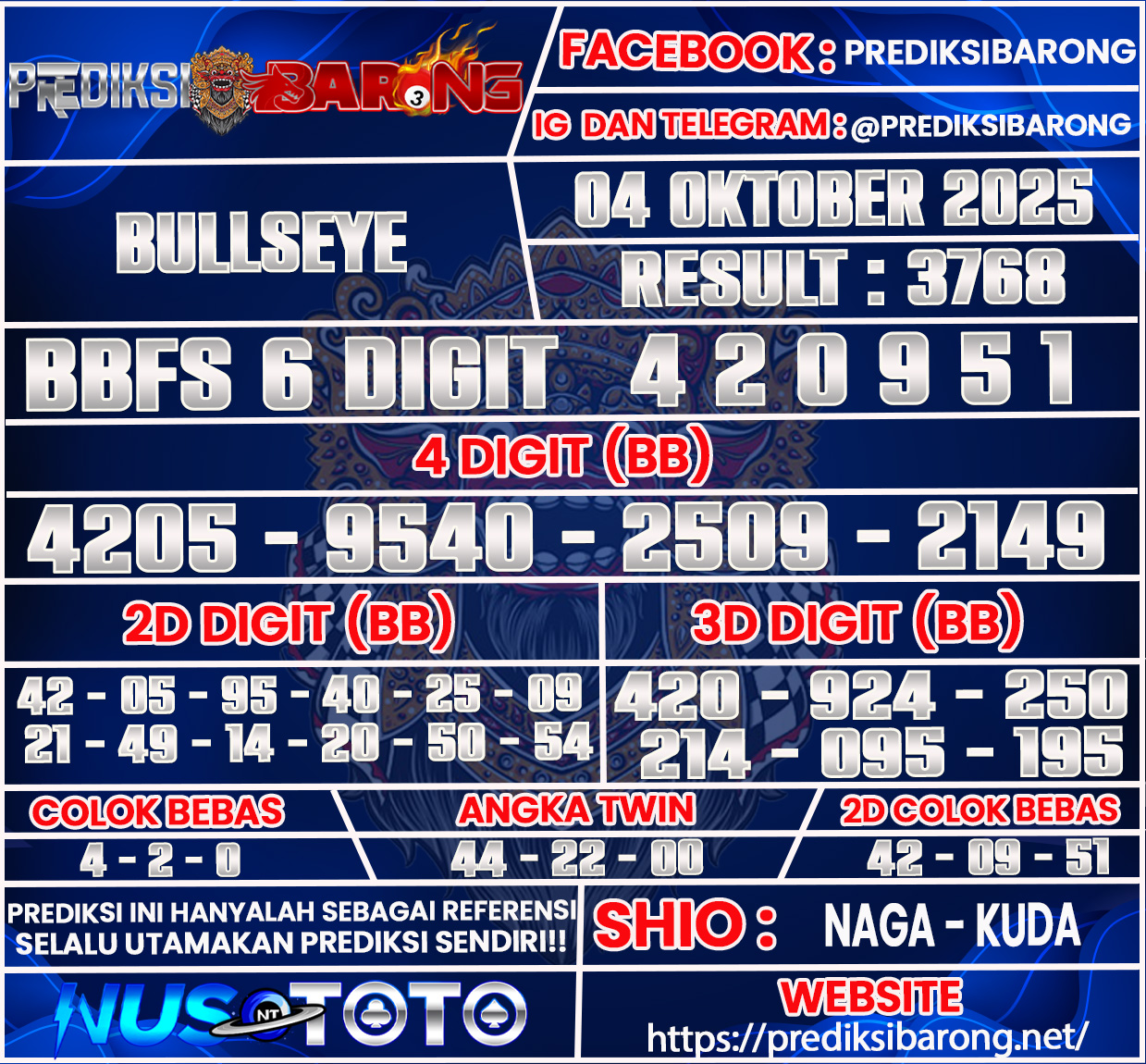 Selamat datang di Situs Prediksi Barong. Prediksi Barong merupakan situs prediksi angka togel yang berasal dari situs togel terpercaya dan teramanah yaitu NUSTOTO. Prediksi Barong sendiri sudah berdiri dari tahun 2019 hingga sekarang dan kualitasnya sudah di uji oleh para ahli paito dan pecinta togel resmi. Hari ini Prediksi Barong telah menyediakan Prediksi BULLSEYE Sabtu 04 Oktober 2025 untuk anda semuanya.