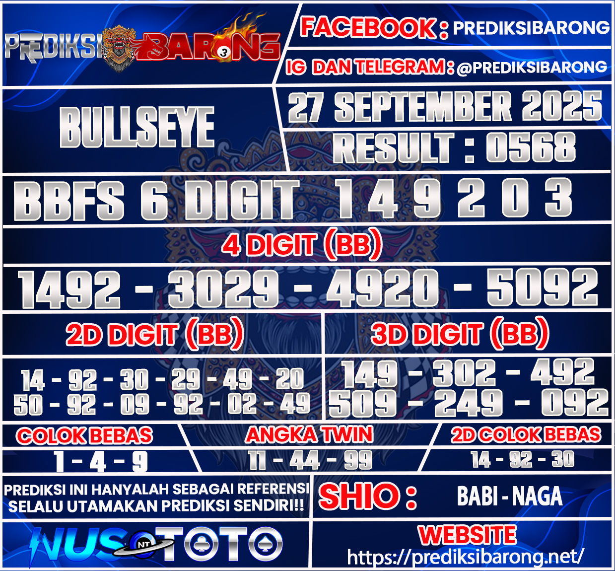 Oleh karena itu tanpa menunggu lama inilah Prediksi BULLSEYE Hari Sabtu Tanggal 27 September 2025 Dari Prediksi Barong :