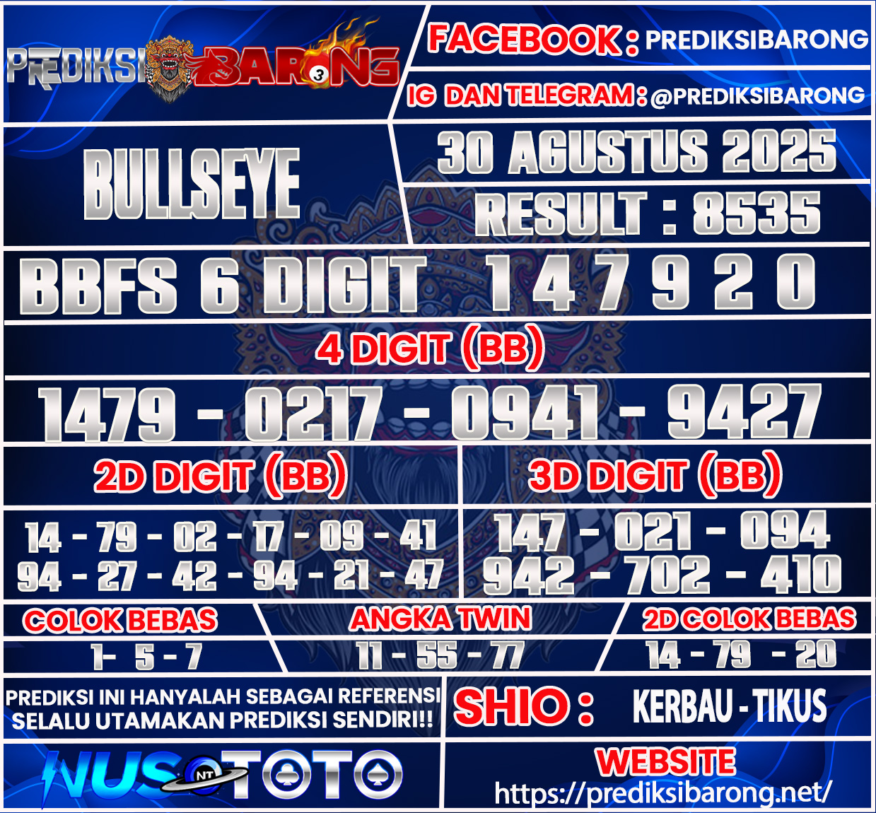Selamat datang di Situs Prediksi Barong. Prediksi Barong merupakan situs prediksi angka togel yang berasal dari situs togel terpercaya dan teramanah yaitu NUSTOTO. Prediksi Barong sendiri sudah berdiri dari tahun 2018 hingga sekarang dan kualitasnya sudah di uji oleh para ahli paito dan pecinta togel resmi. Hari ini Prediksi Barong telah menyediakan Prediksi BULLSEYE Sabtu 30 Agustus 2025 untuk anda semuanya.