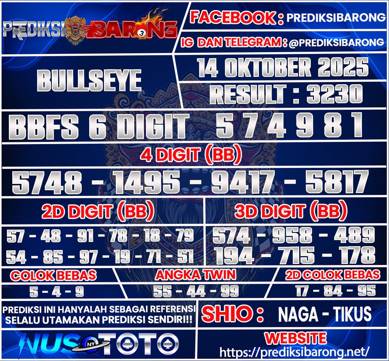 Selamat datang di Situs Prediksi Barong. Prediksi Barong merupakan situs prediksi angka togel yang berasal dari situs togel terpercaya dan teramanah yaitu NUSTOTO. Prediksi Barong sendiri sudah berdiri dari tahun 2019 hingga sekarang dan kualitasnya sudah di uji oleh para ahli paito dan pecinta togel resmi. Hari ini Prediksi Barong telah menyediakan Prediksi BULLSEYE Selasa 14 Oktober 2025 untuk anda semuanya.