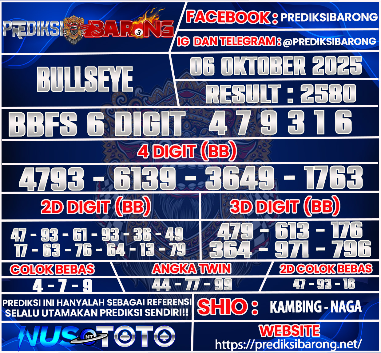 Selamat datang di Situs Prediksi Barong. Prediksi Barong merupakan situs prediksi angka togel yang berasal dari situs togel terpercaya dan teramanah yaitu NUSTOTO. Prediksi Barong sendiri sudah berdiri dari tahun 2019 hingga sekarang dan kualitasnya sudah di uji oleh para ahli paito dan pecinta togel resmi. Hari ini Prediksi Barong telah menyediakan Prediksi BULLSEYE Senin Tanggal 06 Oktober 2025 untuk anda semuanya.