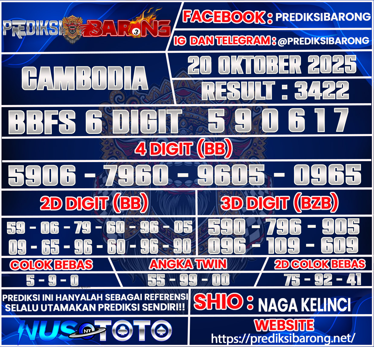 Prediksi Barong adalah layanan prediksi togel yang dirancang khusus untuk membantu para pemain togel dalam meraih keberuntungan. Pada edisi kali ini, kami menyajikan prediksi togel untuk pasar Cambodia pada hari  Minggu 19 Oktober 2025. Dengan analisis mendalam dan metode yang telah teruji, kami berusaha memberikan angka-angka yang memiliki potensi tinggi untuk keluar. Prediksi ini tidak hanya berdasarkan keberuntungan semata, tetapi juga menggunakan data statistik dan pola permainan sebelumnya yang dapat memberikan wawasan lebih bagi para pemain.