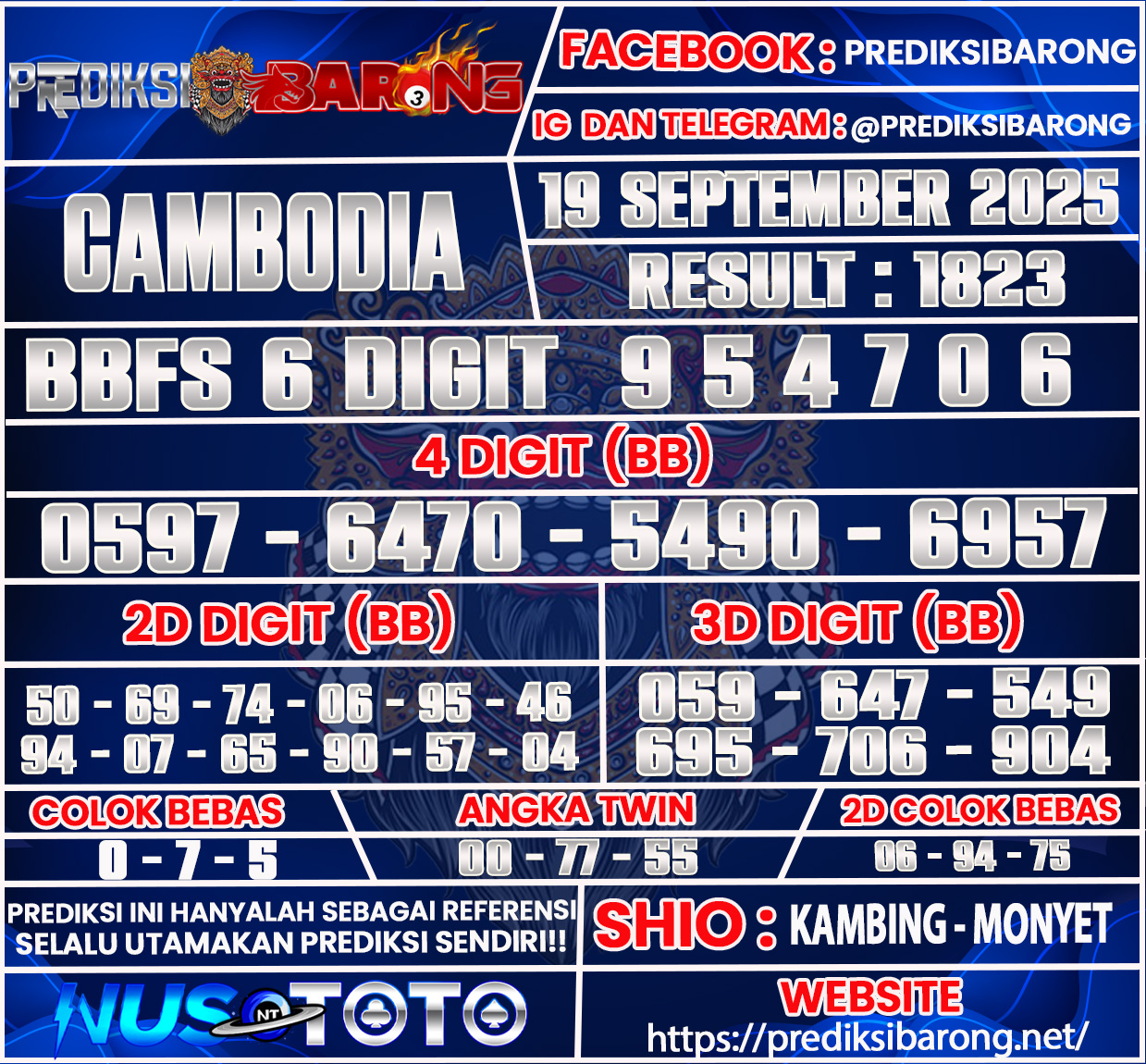 Prediksi Barong adalah layanan prediksi togel yang dirancang khusus untuk membantu para pemain togel dalam meraih keberuntungan. Pada edisi kali ini, kami menyajikan prediksi togel untuk pasar Cambodia pada hari Jumat 19 September 2025. Dengan analisis mendalam dan metode yang telah teruji, kami berusaha memberikan angka-angka yang memiliki potensi tinggi untuk keluar. Prediksi ini tidak hanya berdasarkan keberuntungan semata, tetapi juga menggunakan data statistik dan pola permainan sebelumnya yang dapat memberikan wawasan lebih bagi para pemain.