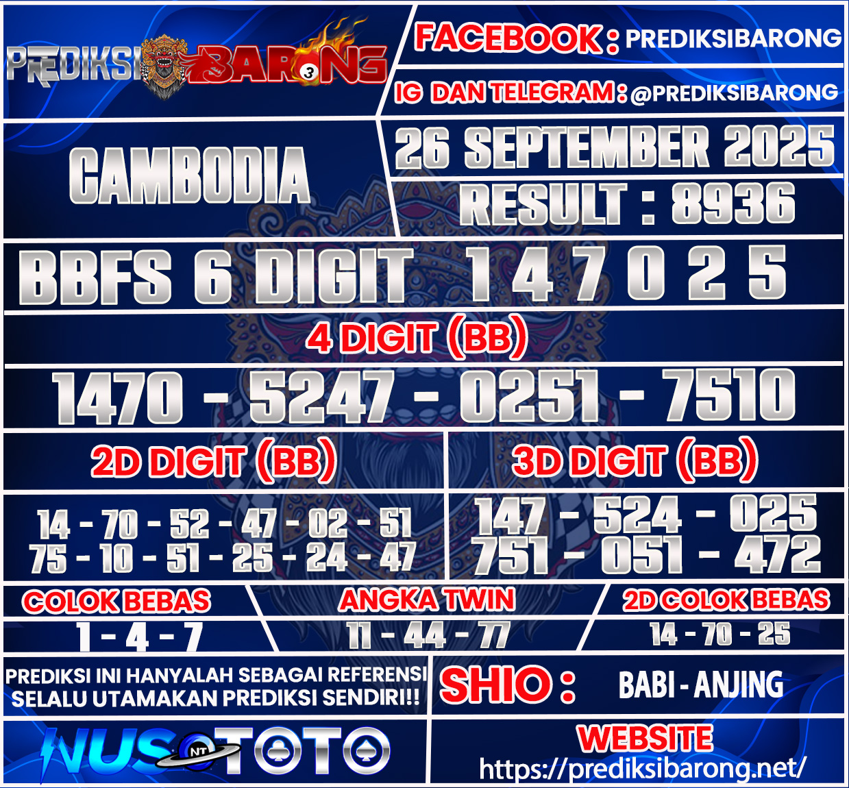 Prediksi Barong adalah layanan prediksi togel yang dirancang khusus untuk membantu para pemain togel dalam meraih keberuntungan. Pada edisi kali ini, kami menyajikan prediksi togel untuk pasar Cambodia pada hari Jumat 26 September 2025. Dengan analisis mendalam dan metode yang telah teruji, kami berusaha memberikan angka-angka yang memiliki potensi tinggi untuk keluar. Prediksi ini tidak hanya berdasarkan keberuntungan semata, tetapi juga menggunakan data statistik dan pola permainan sebelumnya yang dapat memberikan wawasan lebih bagi para pemain.