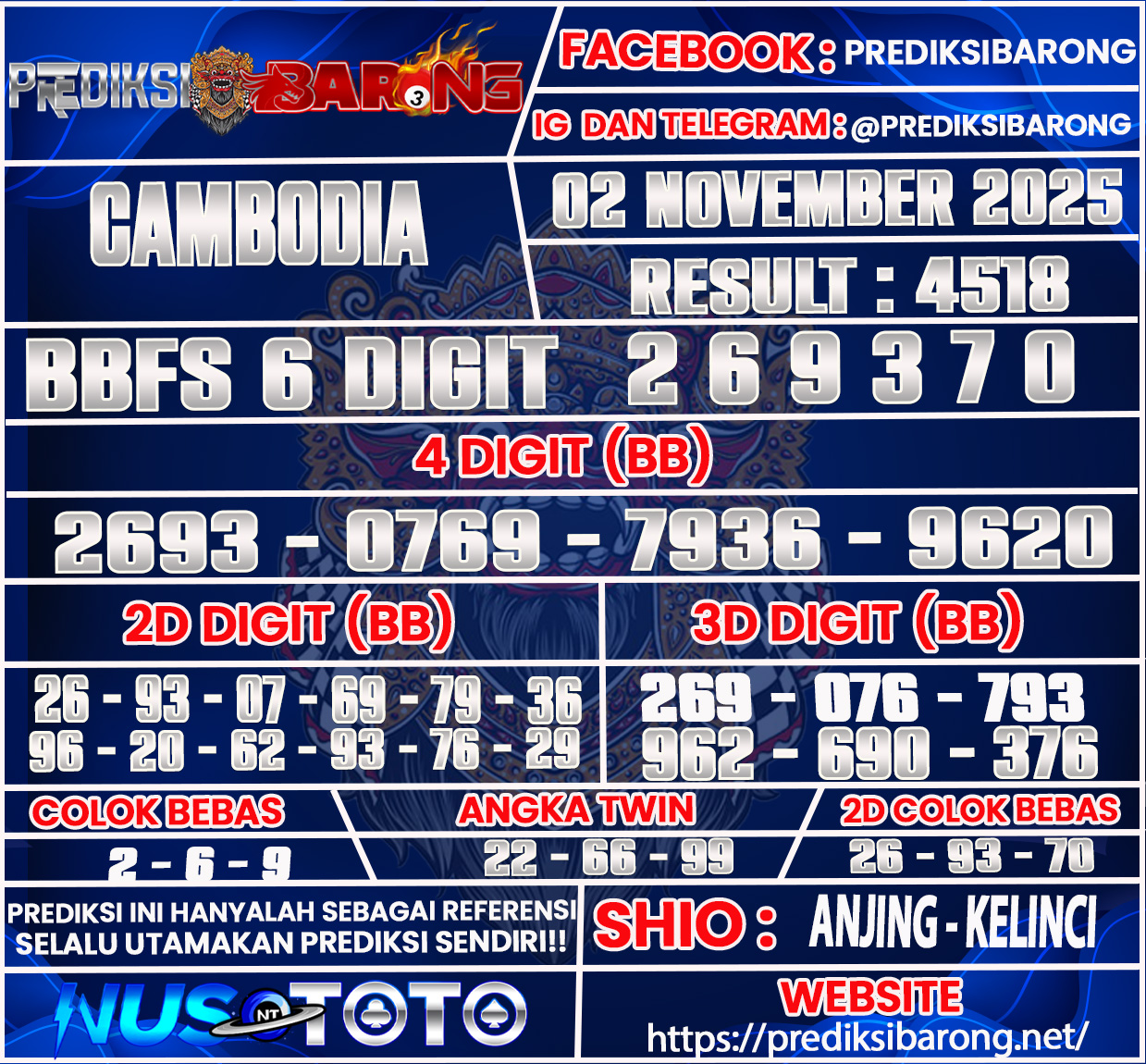 Prediksi Barong adalah layanan prediksi togel yang dirancang khusus untuk membantu para pemain togel dalam meraih keberuntungan. Pada edisi kali ini, kami menyajikan prediksi togel untuk pasar Cambodia pada hari Minggu 19 Oktober 2025. Dengan analisis mendalam dan metode yang telah teruji, kami berusaha memberikan angka-angka yang memiliki potensi tinggi untuk keluar. Prediksi ini tidak hanya berdasarkan keberuntungan semata, tetapi juga menggunakan data statistik dan pola permainan sebelumnya yang dapat memberikan wawasan lebih bagi para pemain.