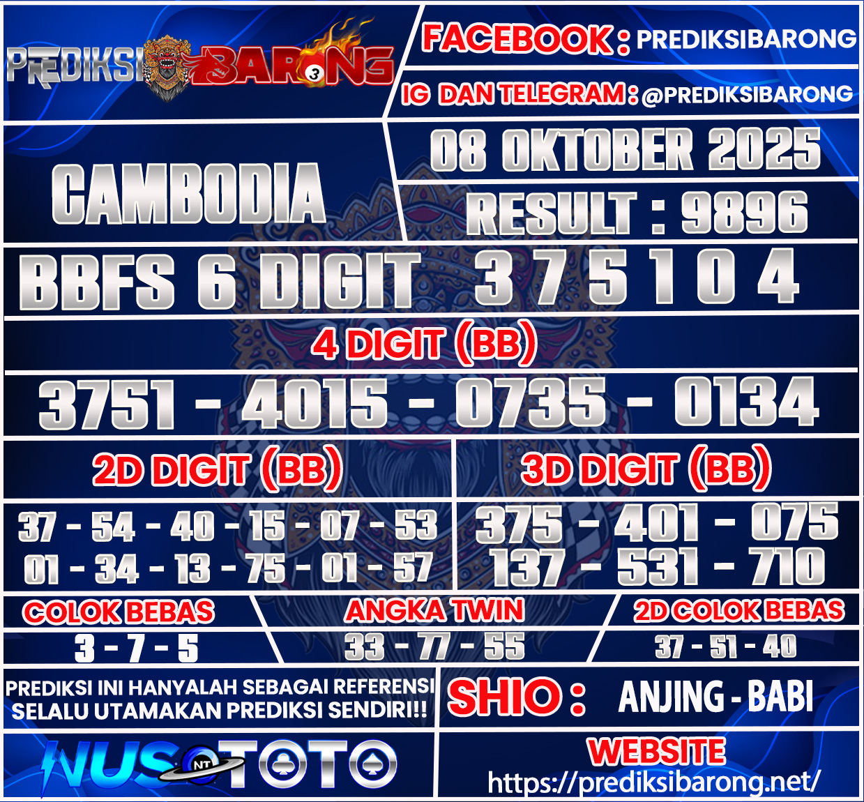Prediksi Barong adalah layanan prediksi togel yang dirancang khusus untuk membantu para pemain togel dalam meraih keberuntungan. Pada edisi kali ini, kami menyajikan prediksi togel untuk pasar Cambodia pada hari Rabu 08 Oktober 2035. Dengan analisis mendalam dan metode yang telah teruji, kami berusaha memberikan angka-angka yang memiliki potensi tinggi untuk keluar. Prediksi ini tidak hanya berdasarkan keberuntungan semata, tetapi juga menggunakan data statistik dan pola permainan sebelumnya yang dapat memberikan wawasan lebih bagi para pemain.