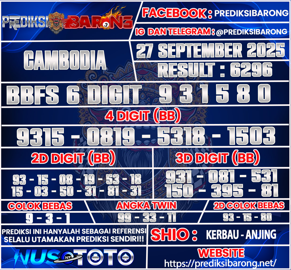 Prediksi Barong adalah layanan prediksi togel yang dirancang khusus untuk membantu para pemain togel dalam meraih keberuntungan. Pada edisi kali ini, kami menyajikan prediksi togel untuk pasar Cambodia pada hari Sabtu 27 September 2025. Dengan analisis mendalam dan metode yang telah teruji, kami berusaha memberikan angka-angka yang memiliki potensi tinggi untuk keluar. Prediksi ini tidak hanya berdasarkan keberuntungan semata, tetapi juga menggunakan data statistik dan pola permainan sebelumnya yang dapat memberikan wawasan lebih bagi para pemain.