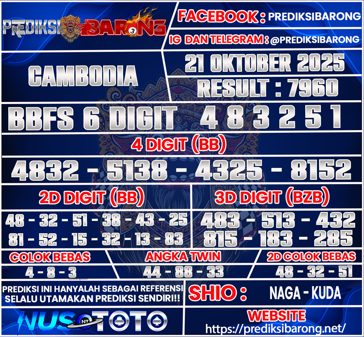 Prediksi Barong adalah layanan prediksi togel yang dirancang khusus untuk membantu para pemain togel dalam meraih keberuntungan. Pada edisi kali ini, kami menyajikan prediksi togel untuk pasar Cambodia pada hari Minggu 19 Oktober 2025. Dengan analisis mendalam dan metode yang telah teruji, kami berusaha memberikan angka-angka yang memiliki potensi tinggi untuk keluar. Prediksi ini tidak hanya berdasarkan keberuntungan semata, tetapi juga menggunakan data statistik dan pola permainan sebelumnya yang dapat memberikan wawasan lebih bagi para pemain.