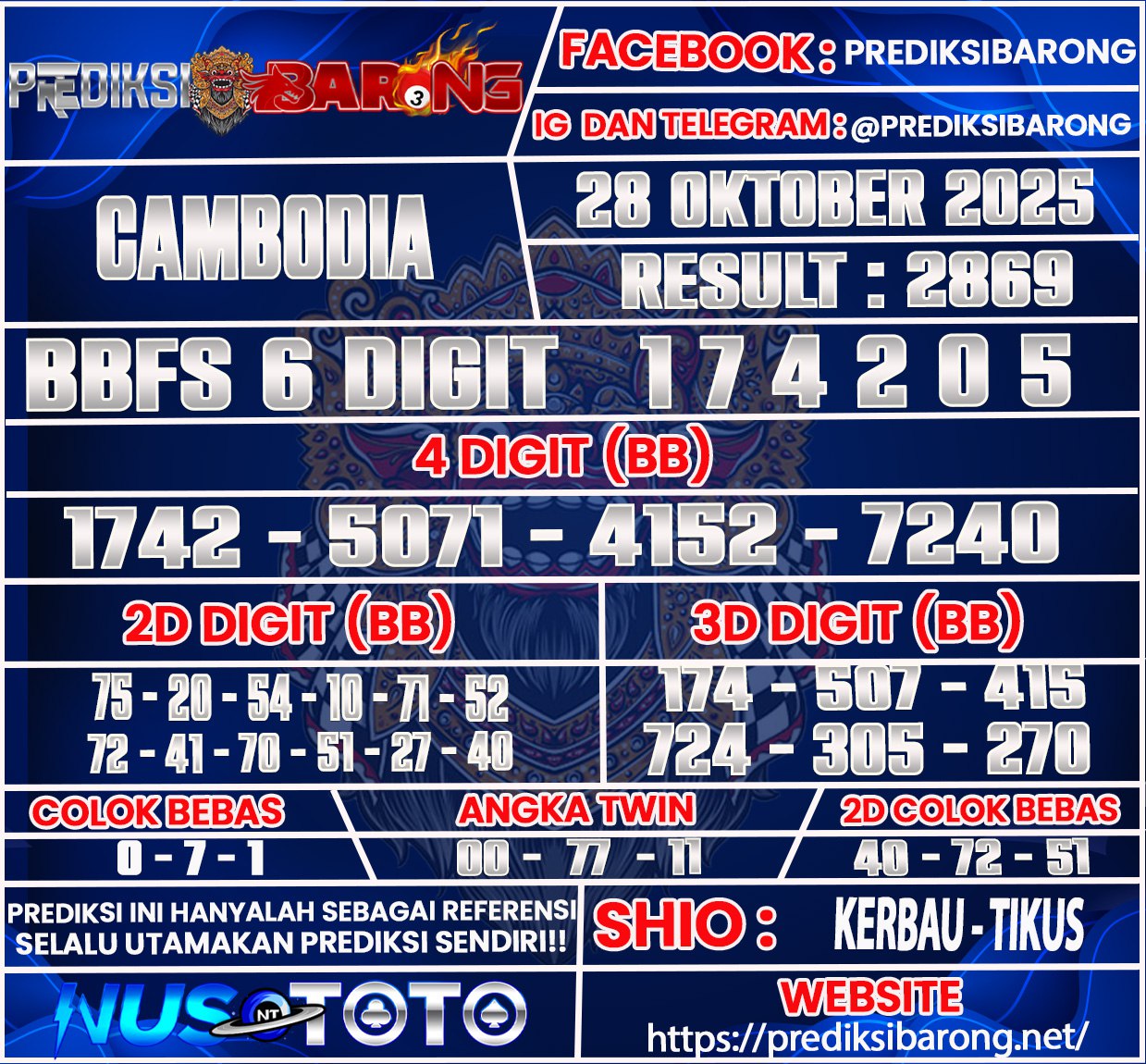 Prediksi Barong adalah layanan prediksi togel yang dirancang khusus untuk membantu para pemain togel dalam meraih keberuntungan. Pada edisi kali ini, kami menyajikan prediksi togel untuk pasar Cambodia pada hari Minggu 19 Oktober 2025. Dengan analisis mendalam dan metode yang telah teruji, kami berusaha memberikan angka-angka yang memiliki potensi tinggi untuk keluar. Prediksi ini tidak hanya berdasarkan keberuntungan semata, tetapi juga menggunakan data statistik dan pola permainan sebelumnya yang dapat memberikan wawasan lebih bagi para pemain.