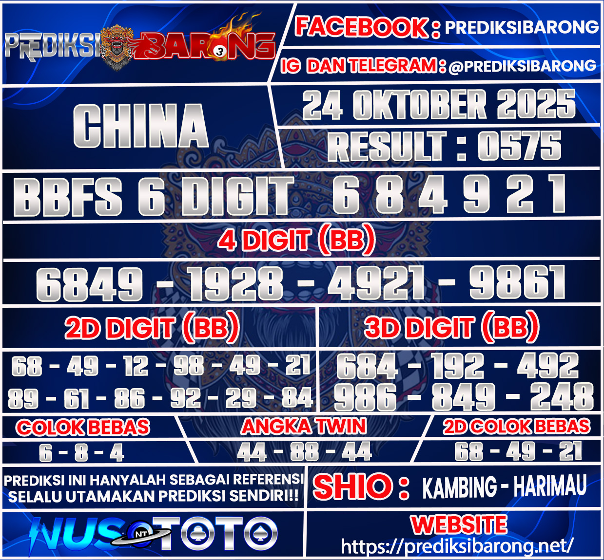 Selamat datang di Situs Prediksi Barong. Prediksi Barong merupakan situs prediksi angka togel yang berasal dari situs togel terpercaya dan teramanah yaitu NUSTOTO. Prediksi Barong sendiri sudah berdiri dari tahun 2019 hingga sekarang dan kualitasnya sudah di uji oleh para ahli paito dan pecinta togel resmi. Hari ini Prediksi Barong telah menyediakan Prediksi China 20 Senin Oktober 2025untuk anda semuanya.
