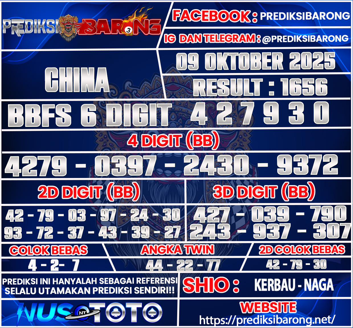 Selamat datang di Situs Prediksi Barong. Prediksi Barong merupakan situs prediksi angka togel yang berasal dari situs togel terpercaya dan teramanah yaitu NUSTOTO. Prediksi Barong sendiri sudah berdiri dari tahun 2019 hingga sekarang dan kualitasnya sudah di uji oleh para ahli paito dan pecinta togel resmi. Hari ini Prediksi Barong telah menyediakan Prediksi China Kamis 09 Oktober 2025 untuk anda semuanya.