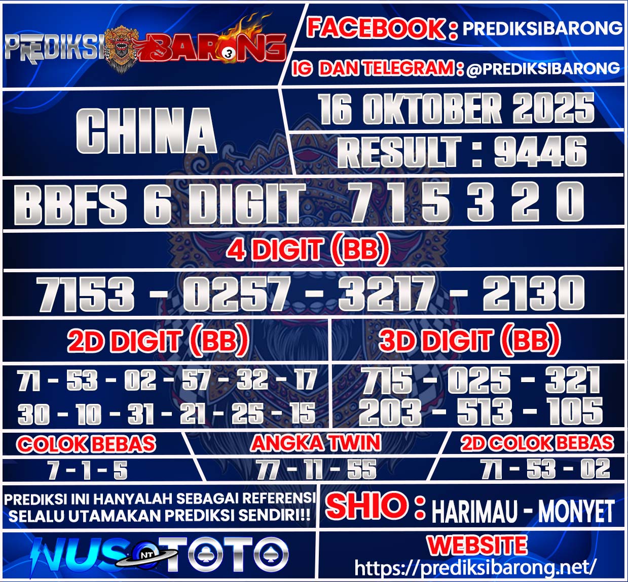Selamat datang di Situs Prediksi Barong. Prediksi Barong merupakan situs prediksi angka togel yang berasal dari situs togel terpercaya dan teramanah yaitu NUSTOTO. Prediksi Barong sendiri sudah berdiri dari tahun 2019 hingga sekarang dan kualitasnya sudah di uji oleh para ahli paito dan pecinta togel resmi. Hari ini Prediksi Barong telah menyediakan Prediksi China Kamis 16Oktober 2025 untuk anda semuanya.