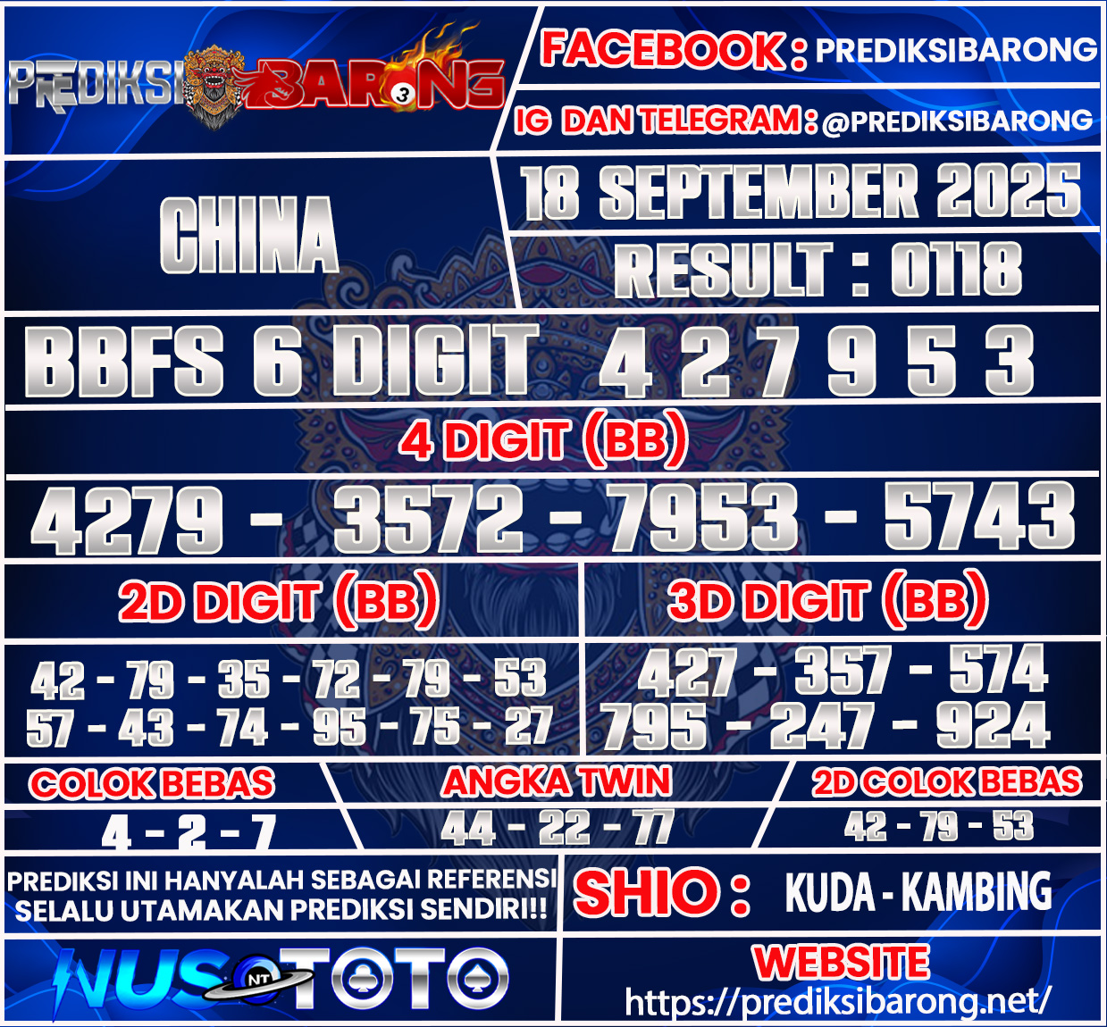 Selamat datang di Situs Prediksi Barong. Prediksi Barong merupakan situs prediksi angka togel yang berasal dari situs togel terpercaya dan teramanah yaitu NUSTOTO. Prediksi Barong sendiri sudah berdiri dari tahun 2018 hingga sekarang dan kualitasnya sudah di uji oleh para ahli paito dan pecinta togel resmi. Hari ini Prediksi Barong telah menyediakan Prediksi China Kamis 18 September 2025 untuk anda semuanya.