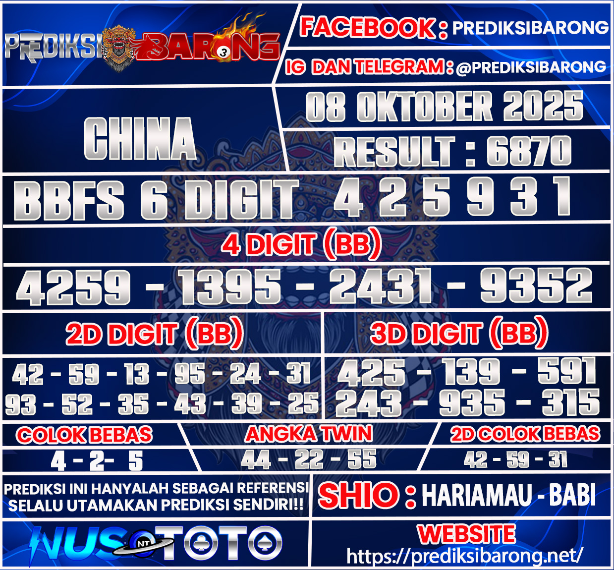 Selamat datang di Situs Prediksi Barong. Prediksi Barong merupakan situs prediksi angka togel yang berasal dari situs togel terpercaya dan teramanah yaitu NUSTOTO. Prediksi Barong sendiri sudah berdiri dari tahun 2019 hingga sekarang dan kualitasnya sudah di uji oleh para ahli paito dan pecinta togel resmi. Hari ini Prediksi Barong telah menyediakan Prediksi China Selasa 07 Oktober 2025 untuk anda semuanya.