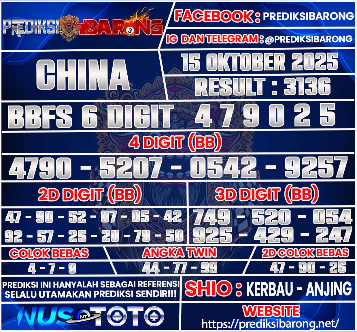 Selamat datang di Situs Prediksi Barong. Prediksi Barong merupakan situs prediksi angka togel yang berasal dari situs togel terpercaya dan teramanah yaitu NUSTOTO. Prediksi Barong sendiri sudah berdiri dari tahun 2019 hingga sekarang dan kualitasnya sudah di uji oleh para ahli paito dan pecinta togel resmi. Hari ini Prediksi Barong telah menyediakan Prediksi China Rabu 15 Oktober 2025 untuk anda semuanya.