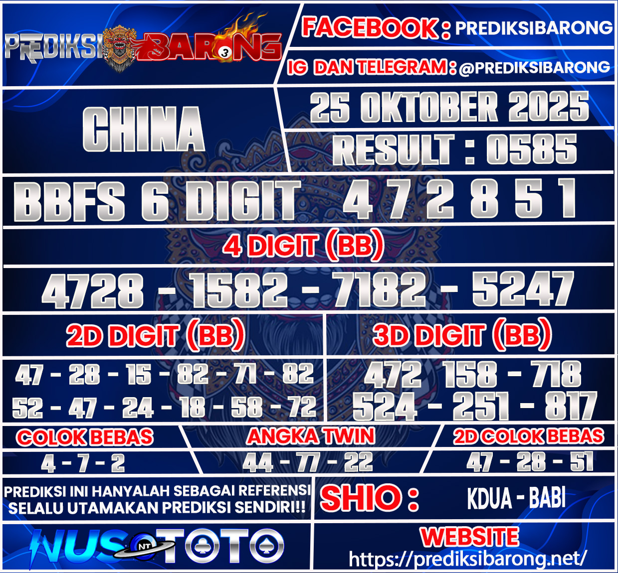 Selamat datang di Situs Prediksi Barong. Prediksi Barong merupakan situs prediksi angka togel yang berasal dari situs togel terpercaya dan teramanah yaitu NUSTOTO. Prediksi Barong sendiri sudah berdiri dari tahun 2019 hingga sekarang dan kualitasnya sudah di uji oleh para ahli paito dan pecinta togel resmi. Hari ini Prediksi Barong telah menyediakan Prediksi China 20 Senin Oktober 2025untuk anda semuanya.
