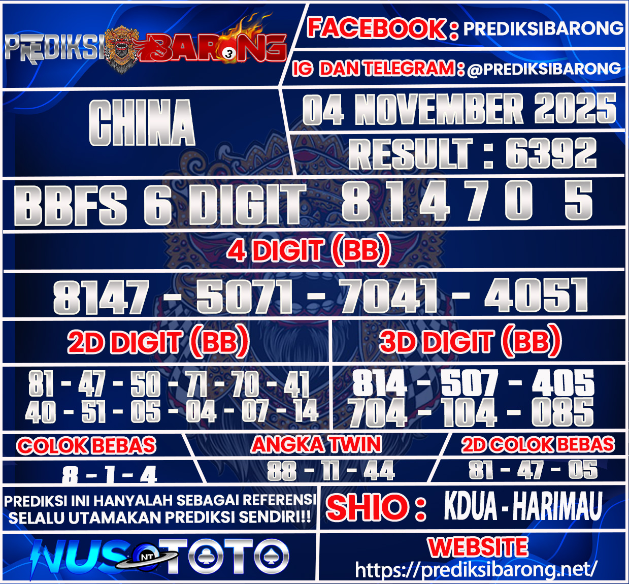 Selamat datang di Situs Prediksi Barong. Prediksi Barong merupakan situs prediksi angka togel yang berasal dari situs togel terpercaya dan teramanah yaitu NUSTOTO. Prediksi Barong sendiri sudah berdiri dari tahun 2019 hingga sekarang dan kualitasnya sudah di uji oleh para ahli paito dan pecinta togel resmi. Hari ini Prediksi Barong telah menyediakan Prediksi China 20 Senin Oktober 2025untuk anda semuanya.