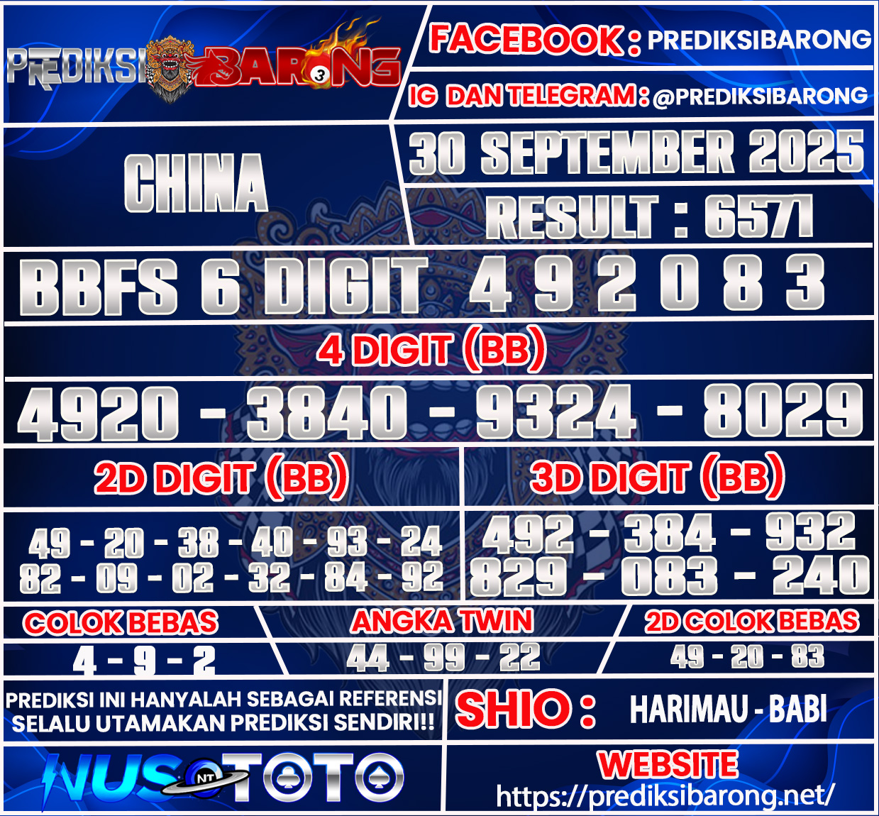 Selamat datang di Situs Prediksi Barong. Prediksi Barong merupakan situs prediksi angka togel yang berasal dari situs togel terpercaya dan teramanah yaitu NUSTOTO. Prediksi Barong sendiri sudah berdiri dari tahun 2019 hingga sekarang dan kualitasnya sudah di uji oleh para ahli paito dan pecinta togel resmi. Hari ini Prediksi Barong telah menyediakan Prediksi China Selasa 30 September 2025 untuk anda semuanya.