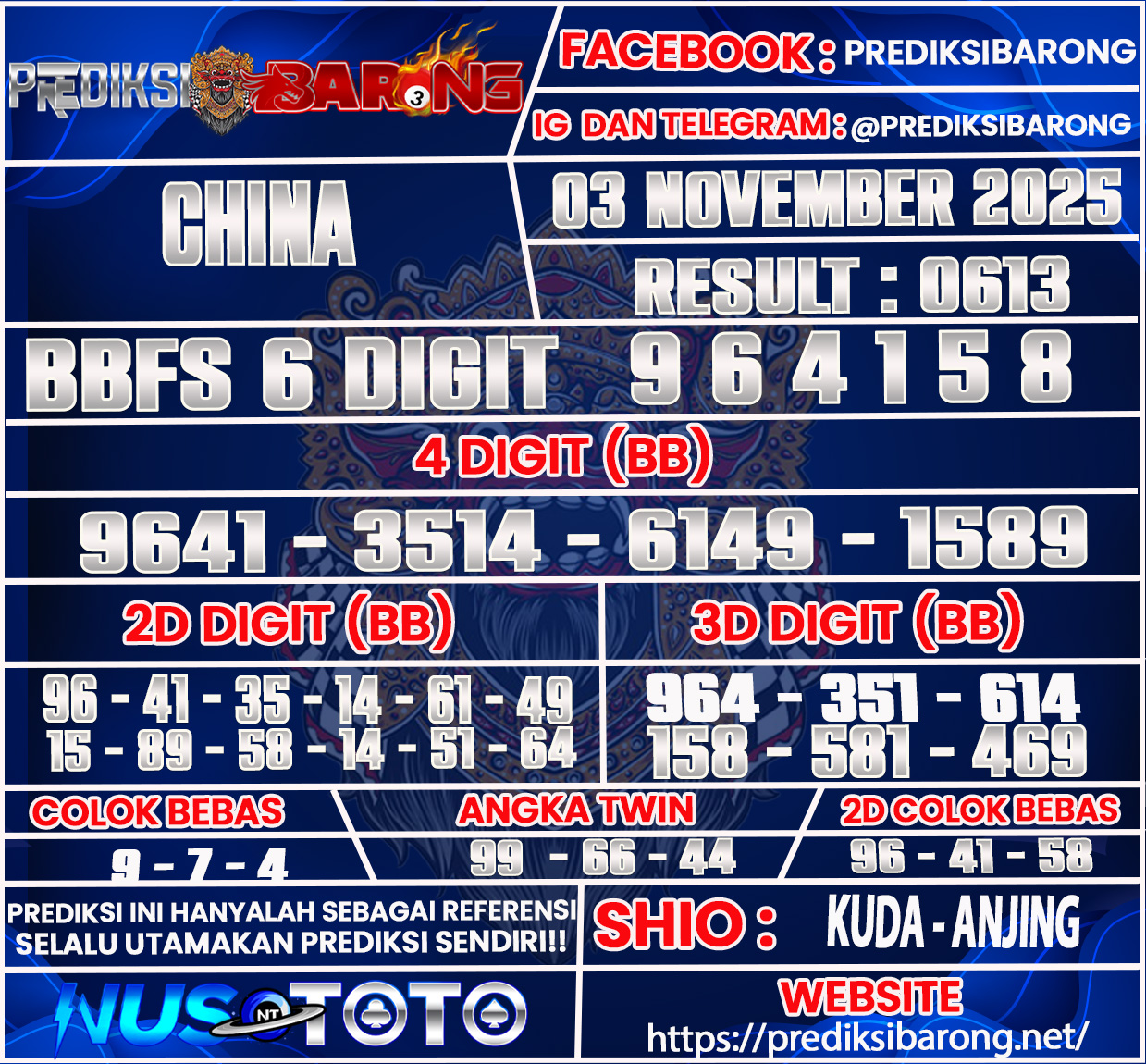Selamat datang di Situs Prediksi Barong. Prediksi Barong merupakan situs prediksi angka togel yang berasal dari situs togel terpercaya dan teramanah yaitu NUSTOTO. Prediksi Barong sendiri sudah berdiri dari tahun 2019 hingga sekarang dan kualitasnya sudah di uji oleh para ahli paito dan pecinta togel resmi. Hari ini Prediksi Barong telah menyediakan Prediksi China 20 Senin Oktober 2025untuk anda semuanya.