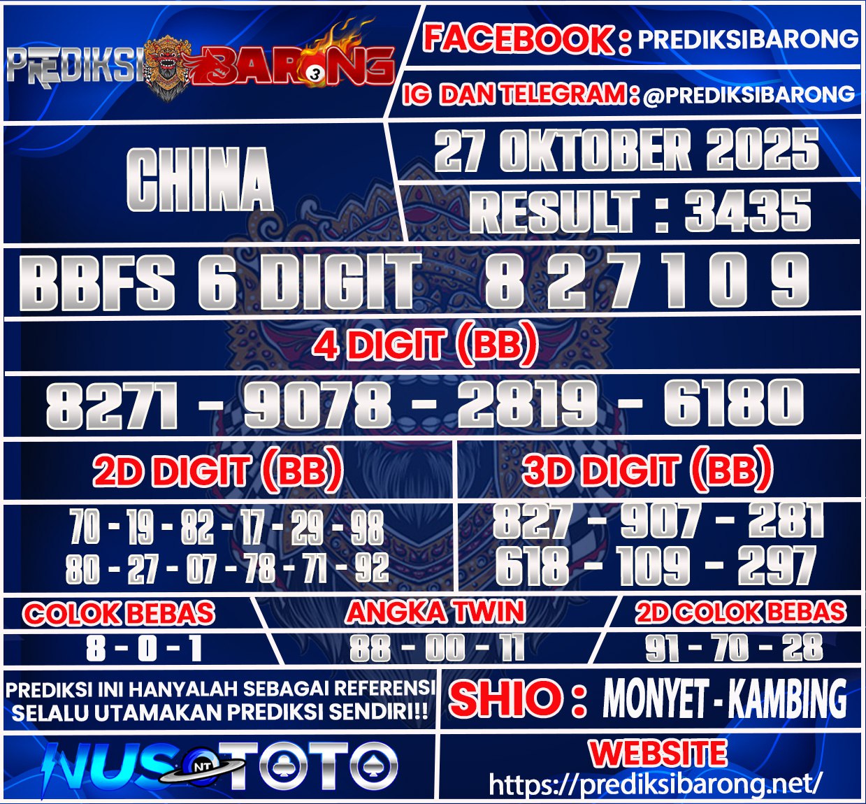 Selamat datang di Situs Prediksi Barong. Prediksi Barong merupakan situs prediksi angka togel yang berasal dari situs togel terpercaya dan teramanah yaitu NUSTOTO. Prediksi Barong sendiri sudah berdiri dari tahun 2019 hingga sekarang dan kualitasnya sudah di uji oleh para ahli paito dan pecinta togel resmi. Hari ini Prediksi Barong telah menyediakan Prediksi China 20 Senin Oktober 2025untuk anda semuanya.