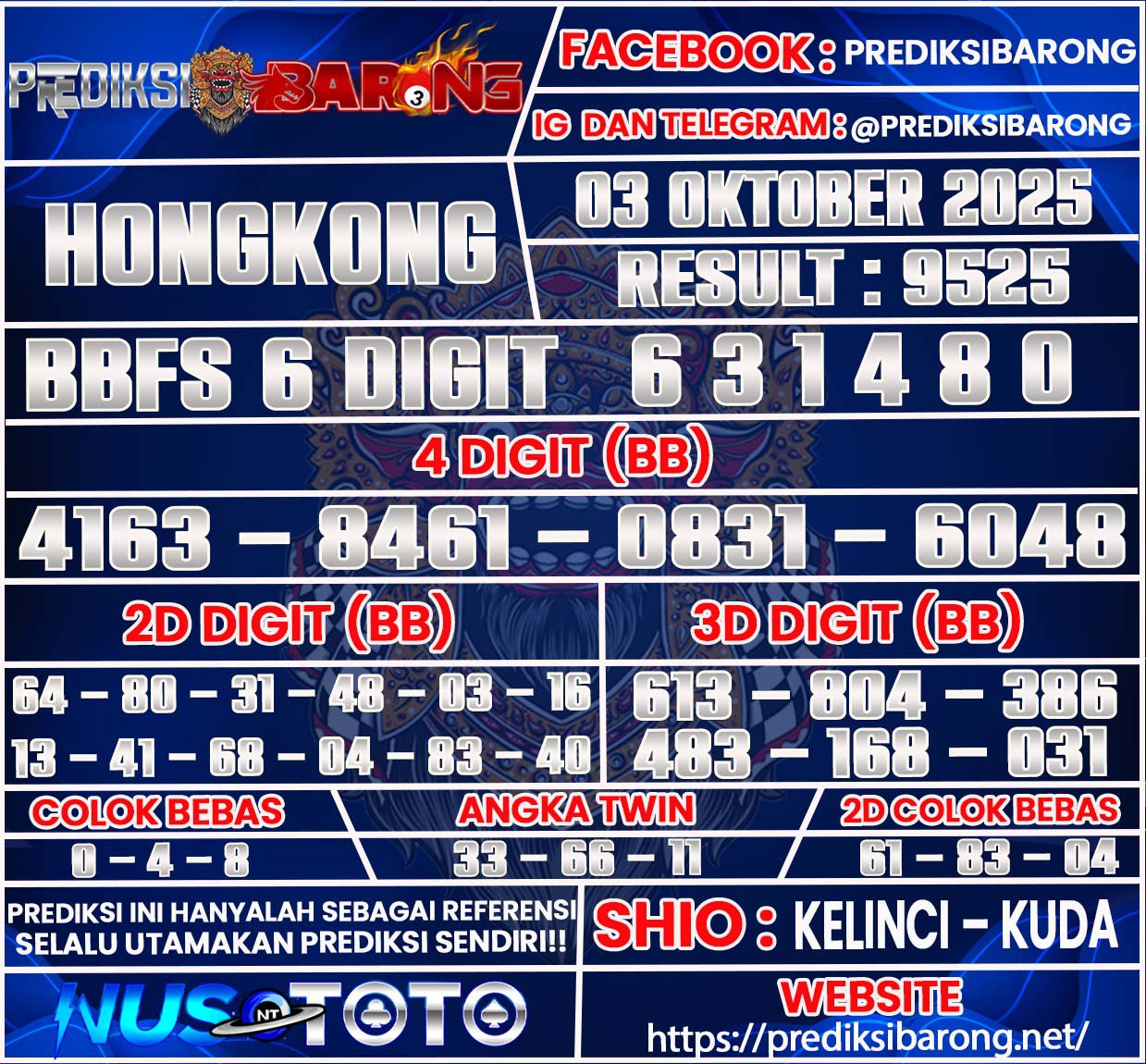 Selamat datang di Situs Prediksi Barong. Prediksi Barong merupakan situs prediksi angka togel yang berasal dari situs togel terpercaya dan teramanah yaitu NUSTOTO. Prediksi Barong sendiri sudah berdiri dari tahun 2018 hingga sekarang dan kualitasnya sudah di uji oleh para ahli paito dan pecinta togel resmi. Hari ini Prediksi Barong telah menyediakan Prediksi HONGKONG Jumat 03 Oktober 2025 untuk anda semuanya.