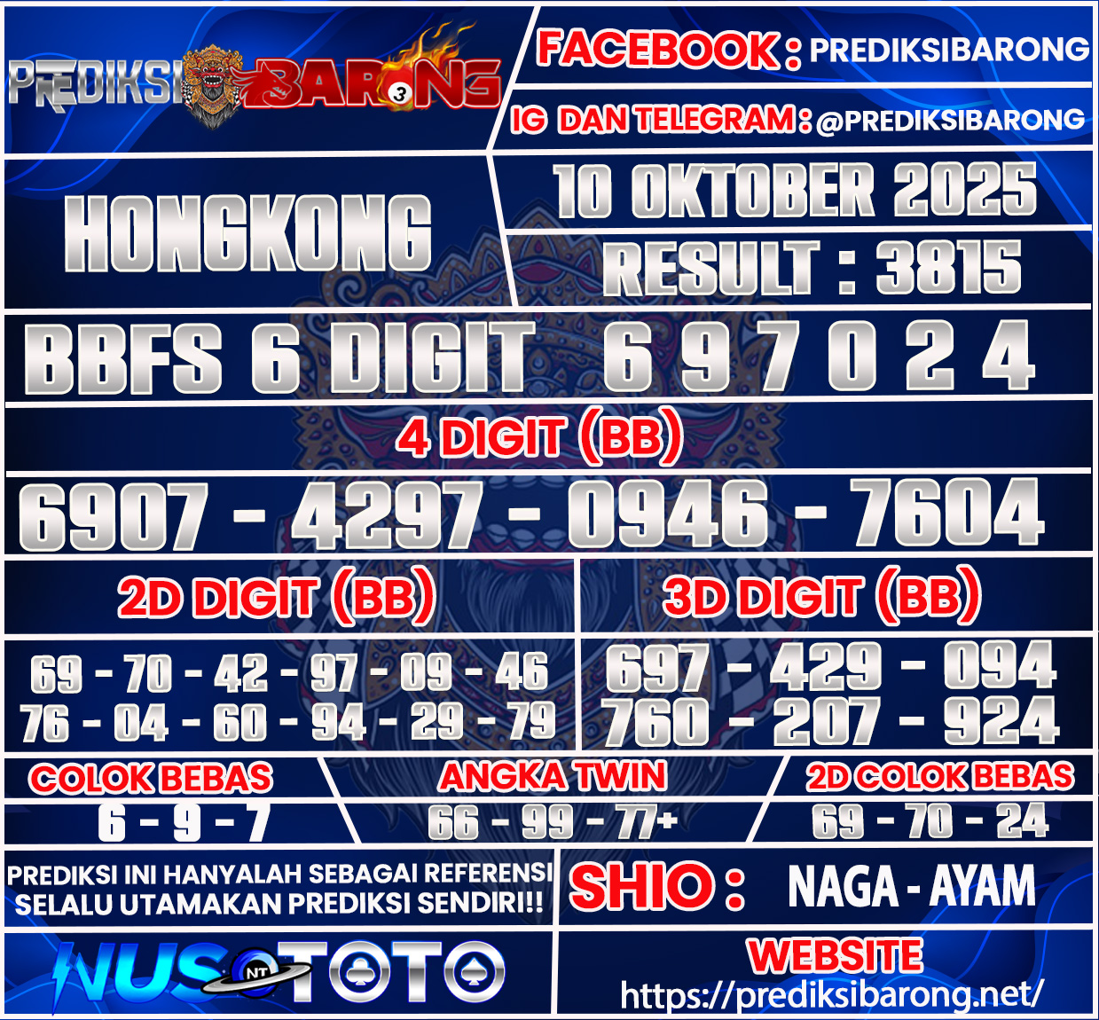 Selamat datang di Situs Prediksi Barong. Prediksi Barong merupakan situs prediksi angka togel yang berasal dari situs togel terpercaya dan teramanah yaitu NUSTOTO. Prediksi Barong sendiri sudah berdiri dari tahun 2018 hingga sekarang dan kualitasnya sudah di uji oleh para ahli paito dan pecinta togel resmi. Hari ini Prediksi Barong telah menyediakan Prediksi HONGKONG Jumat 10 Oktober 2025 untuk anda semuanya.