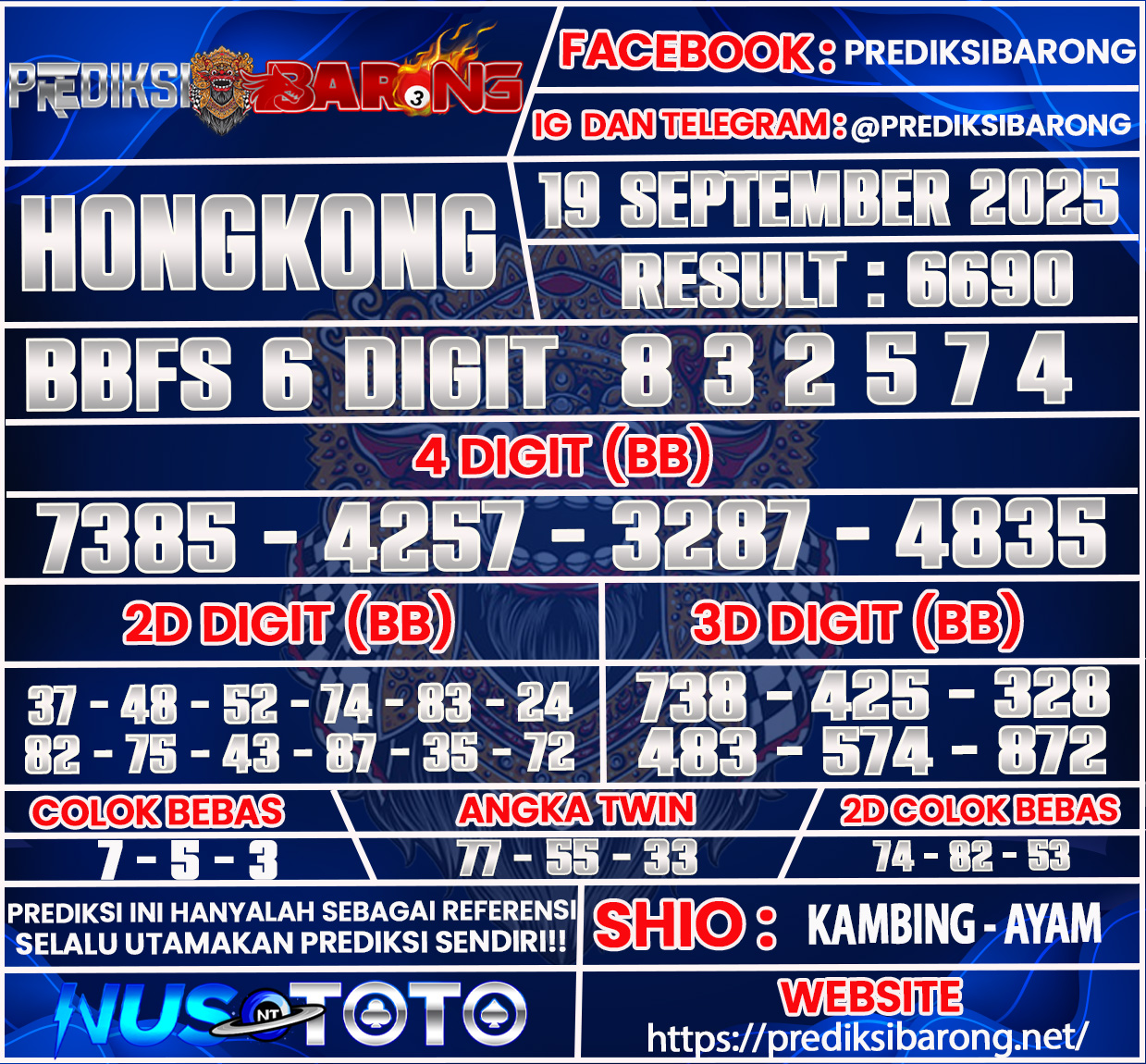 Selamat datang di Situs Prediksi Barong. Prediksi Barong merupakan situs prediksi angka togel yang berasal dari situs togel terpercaya dan teramanah yaitu NUSTOTO. Prediksi Barong sendiri sudah berdiri dari tahun 2018 hingga sekarang dan kualitasnya sudah di uji oleh para ahli paito dan pecinta togel resmi. Hari ini Prediksi Barong telah menyediakan Prediksi HONGKONG Jumat 19 September 2025 untuk anda semuanya.