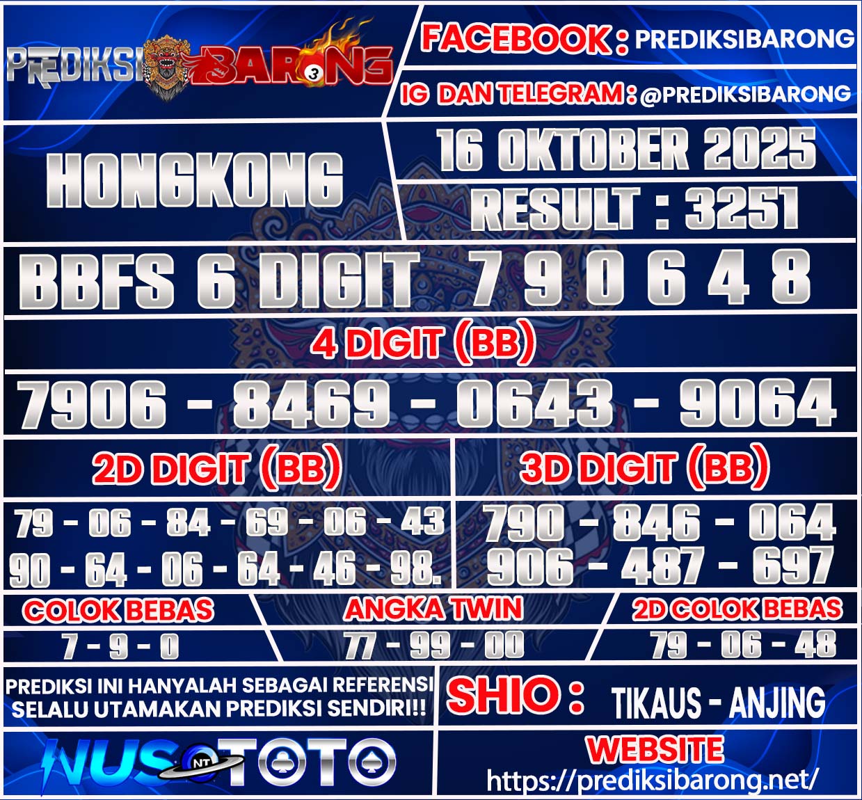 Selamat datang di Situs Prediksi Barong. Prediksi Barong merupakan situs prediksi angka togel yang berasal dari situs togel terpercaya dan teramanah yaitu NUSTOTO. Prediksi Barong sendiri sudah berdiri dari tahun 2018 hingga sekarang dan kualitasnya sudah di uji oleh para ahli paito dan pecinta togel resmi. Hari ini Prediksi Barong telah menyediakan Prediksi HONGKONG Kamis 16 Oktober 2025 untuk anda semuanya.