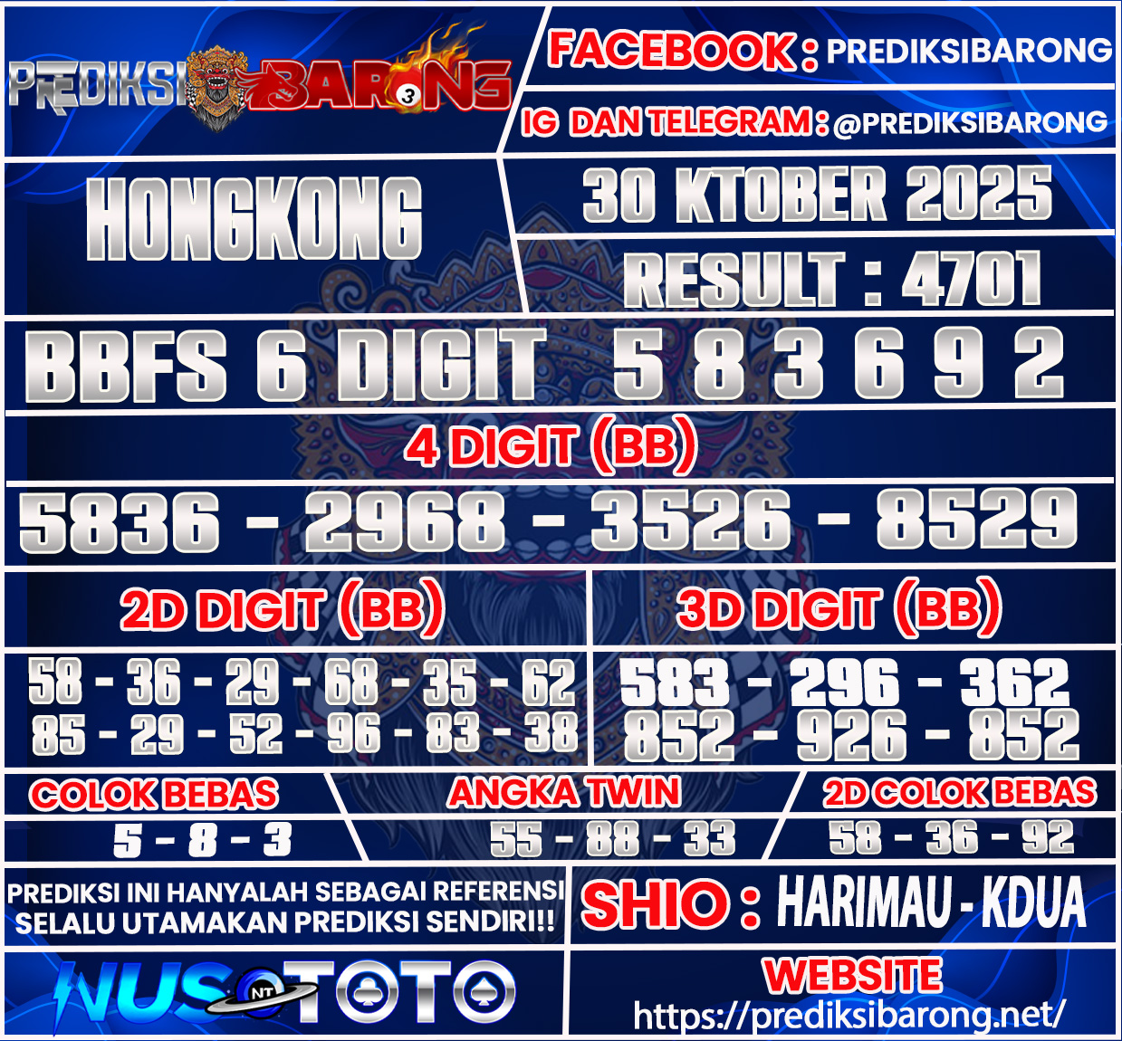 lamat datang di Situs Prediksi Barong. Prediksi Barong merupakan situs prediksi angka togel yang berasal dari situs togel terpercaya dan teramanah yaitu NUSTOTO. Prediksi Barong sendiri sudah berdiri dari tahun 2018 hingga sekarang dan kualitasnya sudah di uji oleh para ahli paito dan pecinta togel resmi. Hari ini Prediksi Barong telah menyediakan Prediksi HONGKONG Kamis 30 Oktober 2025 untuk anda semuanya.