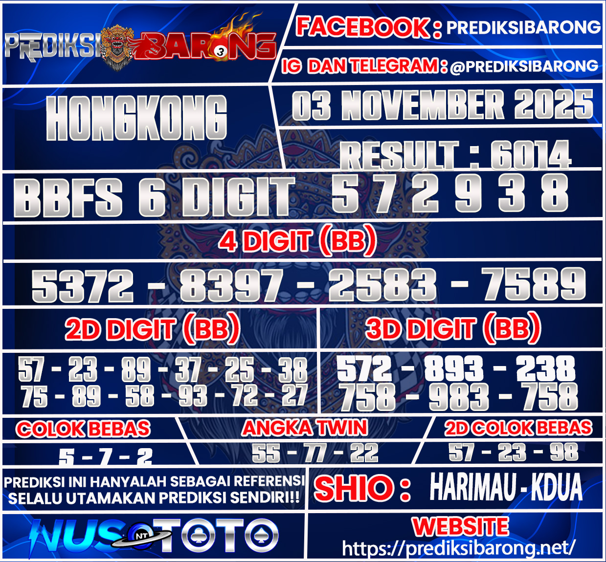 Prediksi Barong adalah layanan prediksi togel yang dirancang khusus untuk membantu para pemain togel dalam meraih keberuntungan. Pada edisi kali ini, kami menyajikan prediksi togel untuk pasar HONGKONG pada hari Minggu 19 Oktober 2025. Dengan analisis mendalam dan metode yang telah teruji, kami berusaha memberikan angka-angka yang memiliki potensi tinggi untuk keluar. Prediksi ini tidak hanya berdasarkan keberuntungan semata, tetapi juga menggunakan data statistik dan pola permainan sebelumnya yang dapat memberikan wawasan lebih bagi para pemain.