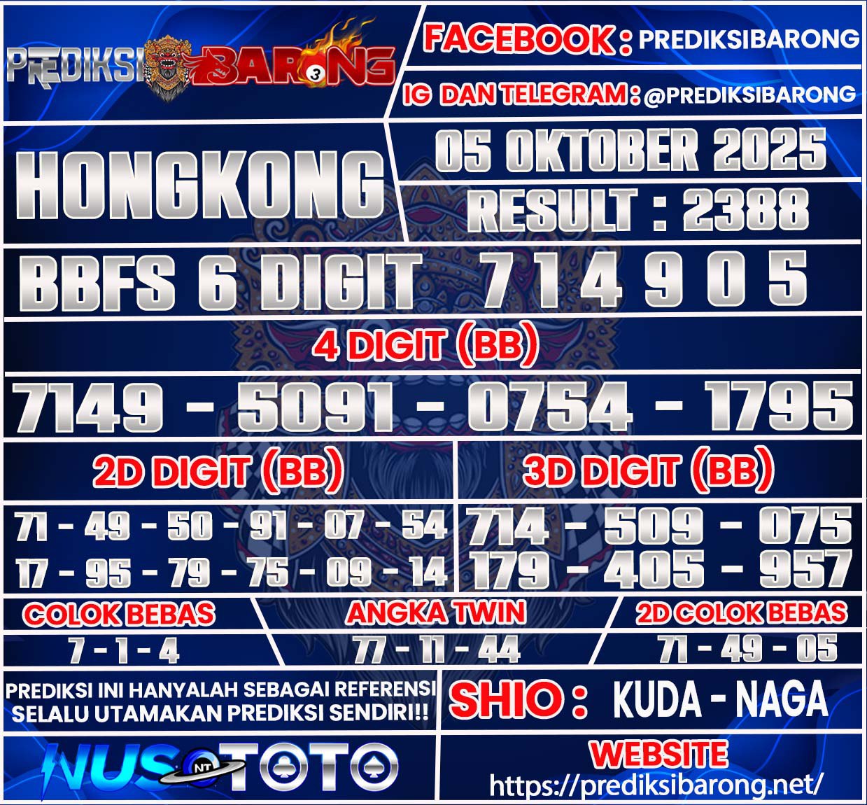 Selamat datang di Situs Prediksi Barong. Prediksi Barong merupakan situs prediksi angka togel yang berasal dari situs togel terpercaya dan teramanah yaitu NUSTOTO. Prediksi Barong sendiri sudah berdiri dari tahun 2018 hingga sekarang dan kualitasnya sudah di uji oleh para ahli paito dan pecinta togel resmi. Hari ini Prediksi Barong telah menyediakan Prediksi HONGKONG Minggu 05 Oktober 2025 untuk anda semuanya.
