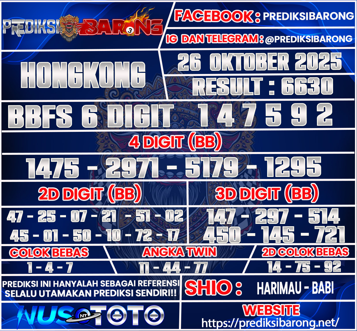 lamat datang di Situs Prediksi Barong. Prediksi Barong merupakan situs prediksi angka togel yang berasal dari situs togel terpercaya dan teramanah yaitu NUSTOTO. Prediksi Barong sendiri sudah berdiri dari tahun 2018 hingga sekarang dan kualitasnya sudah di uji oleh para ahli paito dan pecinta togel resmi. Hari ini Prediksi Barong telah menyediakan Prediksi HONGKONG Minggu 26 Oktober 2025 untuk anda semuanya.