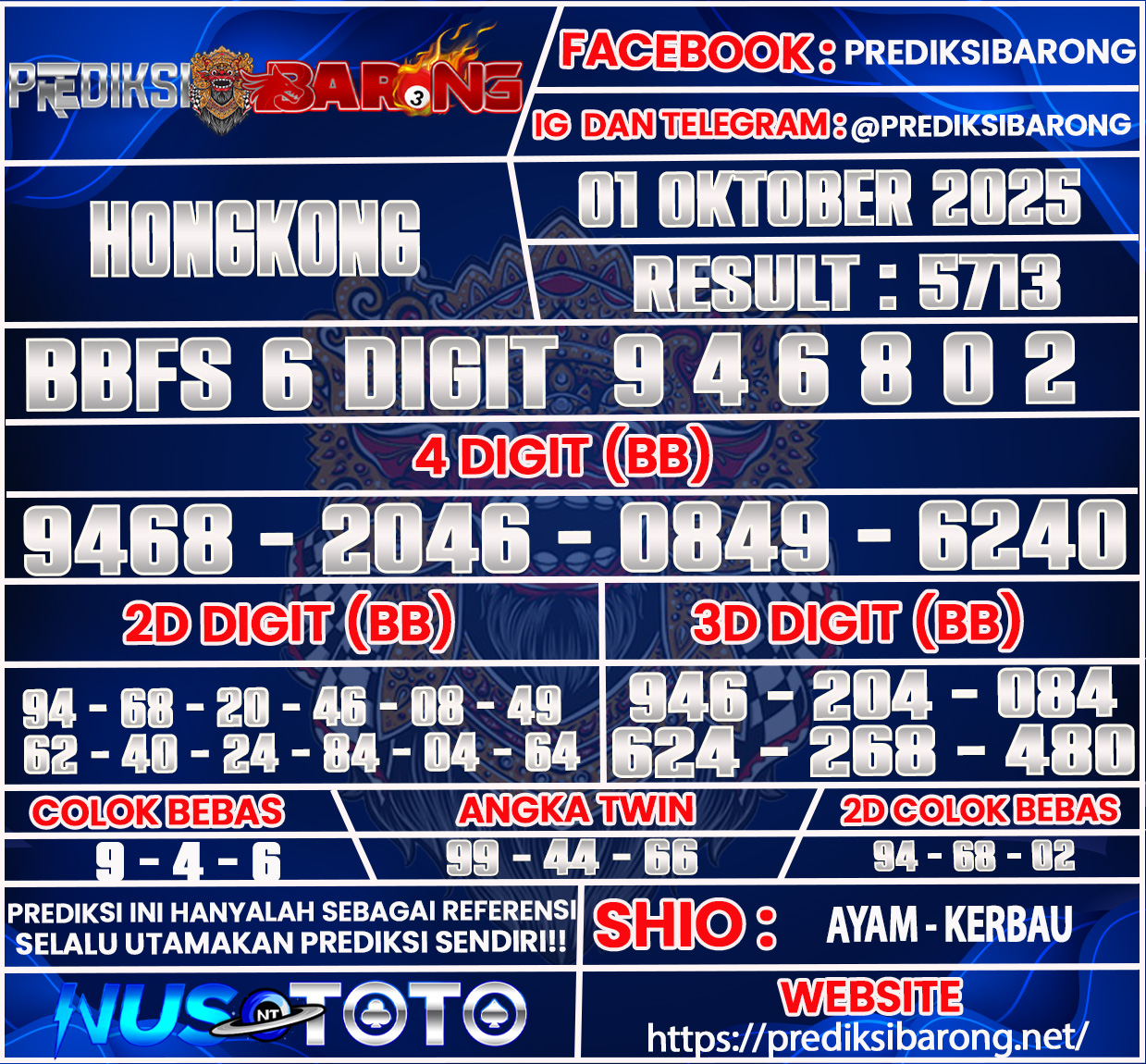 Selamat datang di Situs Prediksi Barong. Prediksi Barong merupakan situs prediksi angka togel yang berasal dari situs togel terpercaya dan teramanah yaitu NUSTOTO. Prediksi Barong sendiri sudah berdiri dari tahun 2018 hingga sekarang dan kualitasnya sudah di uji oleh para ahli paito dan pecinta togel resmi. Hari ini Prediksi Barong telah menyediakan Prediksi HONGKONG Rabu 01 Oktober 2025 untuk anda semuanya.