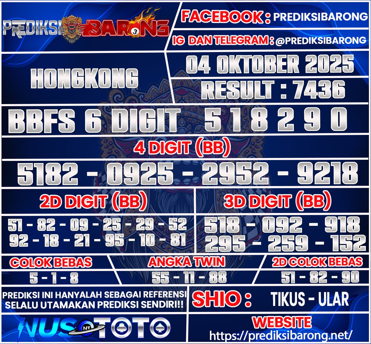 Selamat datang di Situs Prediksi Barong. Prediksi Barong merupakan situs prediksi angka togel yang berasal dari situs togel terpercaya dan teramanah yaitu NUSTOTO. Prediksi Barong sendiri sudah berdiri dari tahun 2018 hingga sekarang dan kualitasnya sudah di uji oleh para ahli paito dan pecinta togel resmi. Hari ini Prediksi Barong telah menyediakan Prediksi HONGKONG Sabtu 04Oktober 2025 untuk anda semuanya.