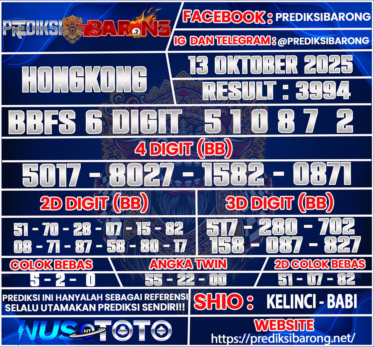 Prediksi Barong adalah layanan prediksi togel yang dirancang khusus untuk membantu para pemain togel dalam meraih keberuntungan. Pada edisi kali ini, kami menyajikan prediksi togel untuk pasar HONGKONG pada hari Senin 13 Oktober2025. Dengan analisis mendalam dan metode yang telah teruji, kami berusaha memberikan angka-angka yang memiliki potensi tinggi untuk keluar. Prediksi ini tidak hanya berdasarkan keberuntungan semata, tetapi juga menggunakan data statistik dan pola permainan sebelumnya yang dapat memberikan wawasan lebih bagi para pemain.