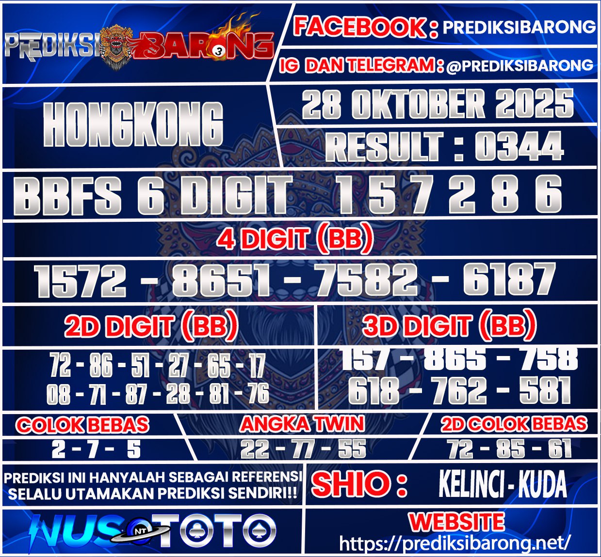 lamat datang di Situs Prediksi Barong. Prediksi Barong merupakan situs prediksi angka togel yang berasal dari situs togel terpercaya dan teramanah yaitu NUSTOTO. Prediksi Barong sendiri sudah berdiri dari tahun 2018 hingga sekarang dan kualitasnya sudah di uji oleh para ahli paito dan pecinta togel resmi. Hari ini Prediksi Barong telah menyediakan Prediksi HONGKONG Minggu 26 Oktober 2025 untuk anda semuanya.