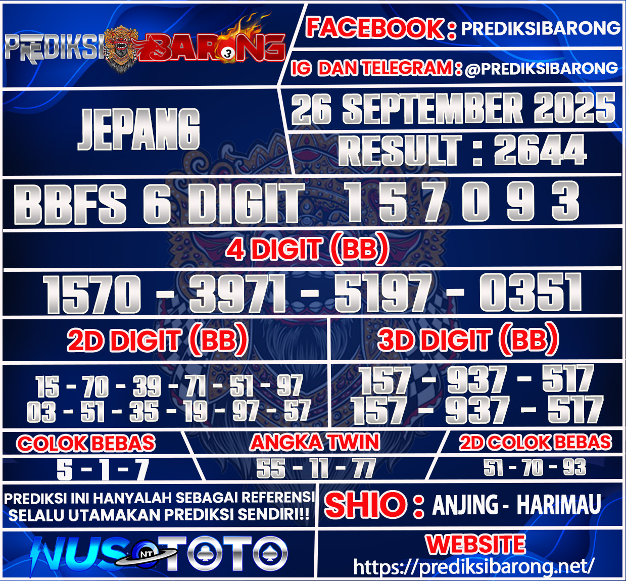 Selamat datang di Situs Prediksi Barong. Prediksi Barong merupakan situs prediksi angka togel yang berasal dari situs togel terpercaya dan teramanah yaitu NUSTOTO. Prediksi Barong sendiri sudah berdiri dari tahun 2019 hingga sekarang dan kualitasnya sudah di uji oleh para ahli paito dan pecinta togel resmi. Hari ini Prediksi Barong telah menyediakan Prediksi Jepang  Jumat 26 September Agustus 2025 untuk anda semuanya.