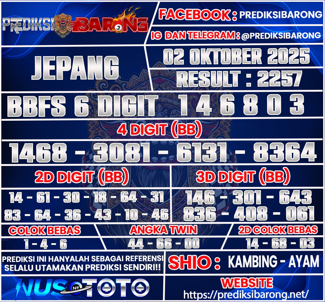 Selamat datang di Situs Prediksi Barong. Prediksi Barong merupakan situs prediksi angka togel yang berasal dari situs togel terpercaya dan teramanah yaitu NUSTOTO. Prediksi Barong sendiri sudah berdiri dari tahun 2019 hingga sekarang dan kualitasnya sudah di uji oleh para ahli paito dan pecinta togel resmi. Hari ini Prediksi Barong telah menyediakan Prediksi Jepang Kamis 02 Oktober 2025 untuk anda semuanya.