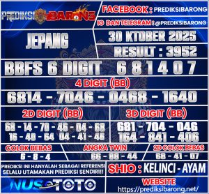 Prediksi Barong adalah layanan prediksi togel yang dirancang khusus untuk membantu para pemain togel dalam meraih keberuntungan. Pada edisi kali ini, kami menyajikan prediksi togel untuk pasar Jepang pada hari Minggu 19 Oktober 2025 Dengan analisis mendalam dan metode yang telah teruji, kami berusaha memberikan angka-angka yang memiliki potensi tinggi untuk keluar. Prediksi ini tidak hanya berdasarkan keberuntungan semata, tetapi juga menggunakan data statistik dan pola permainan sebelumnya yang dapat memberikan wawasan lebih bagi para pemain.